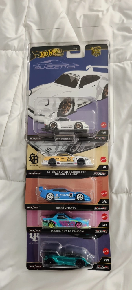 Five collectible Hot Wheels Premium Silhouettes cars. Includes a 930 Porsche RWB, Nissan R34 Skyline, Nissan 300ZX, Mazda RX7 FC Pandem, and McLaren 720s.
