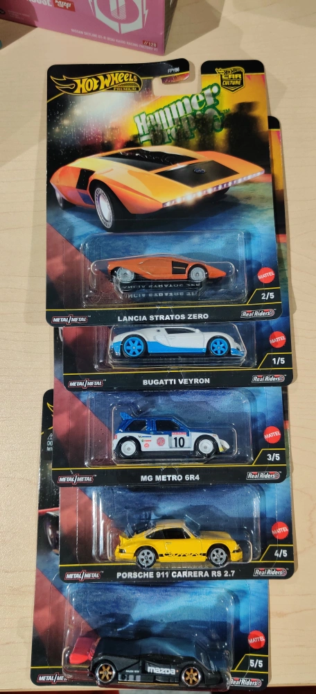 Five collectible Hot Wheels Premium die-cast cars. Includes Lancia Stratos Zero, Bugatti Veyron, MG Metro 6R4, Porsche 911 Carrera RS 2.7, and Mazda 787B. Metal/metal. New in package.