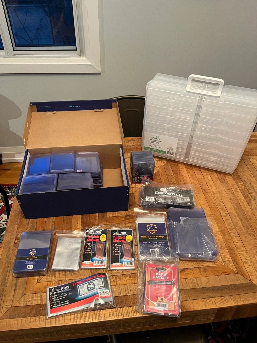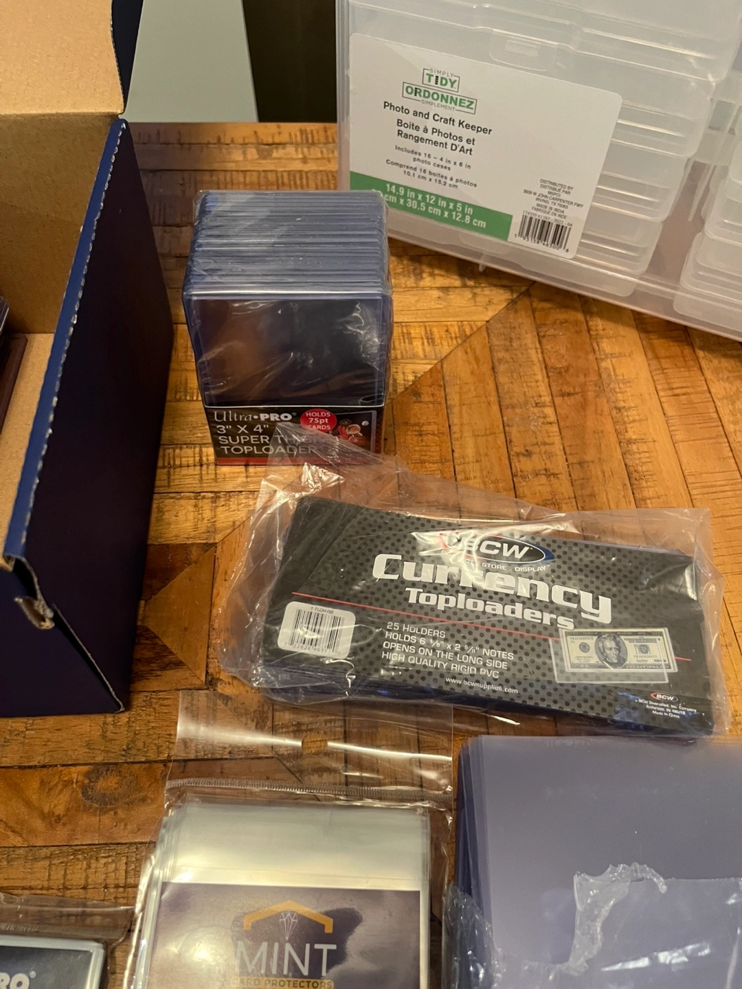 Large collection of card supplies. Includes Ultra Pro sleeves, toploaders (approximately 250), and currency sleeves. Also resealable team bags from Mint Card Protectors and Card Saver I holders.