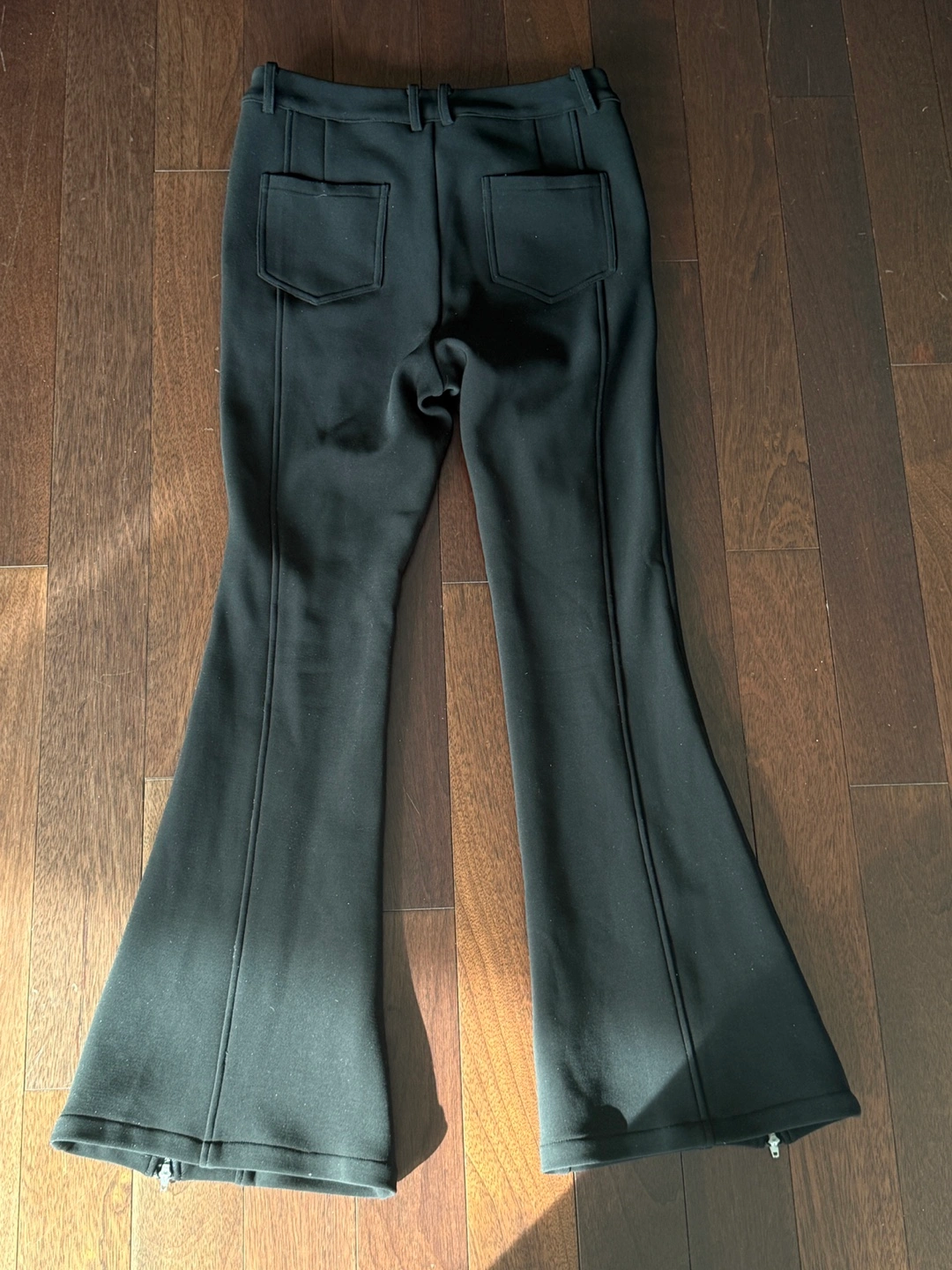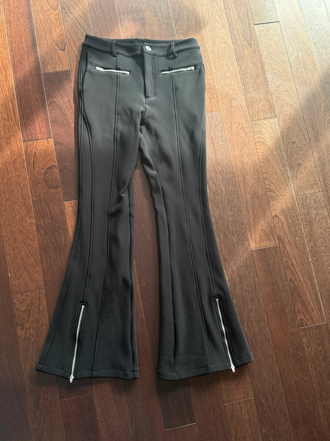 Very unique style. Features a flare leg, zipper detailing at the sides and pockets. Button and zip closure. Waist is around 30.7 inches, too big for me. Has some stretch.
