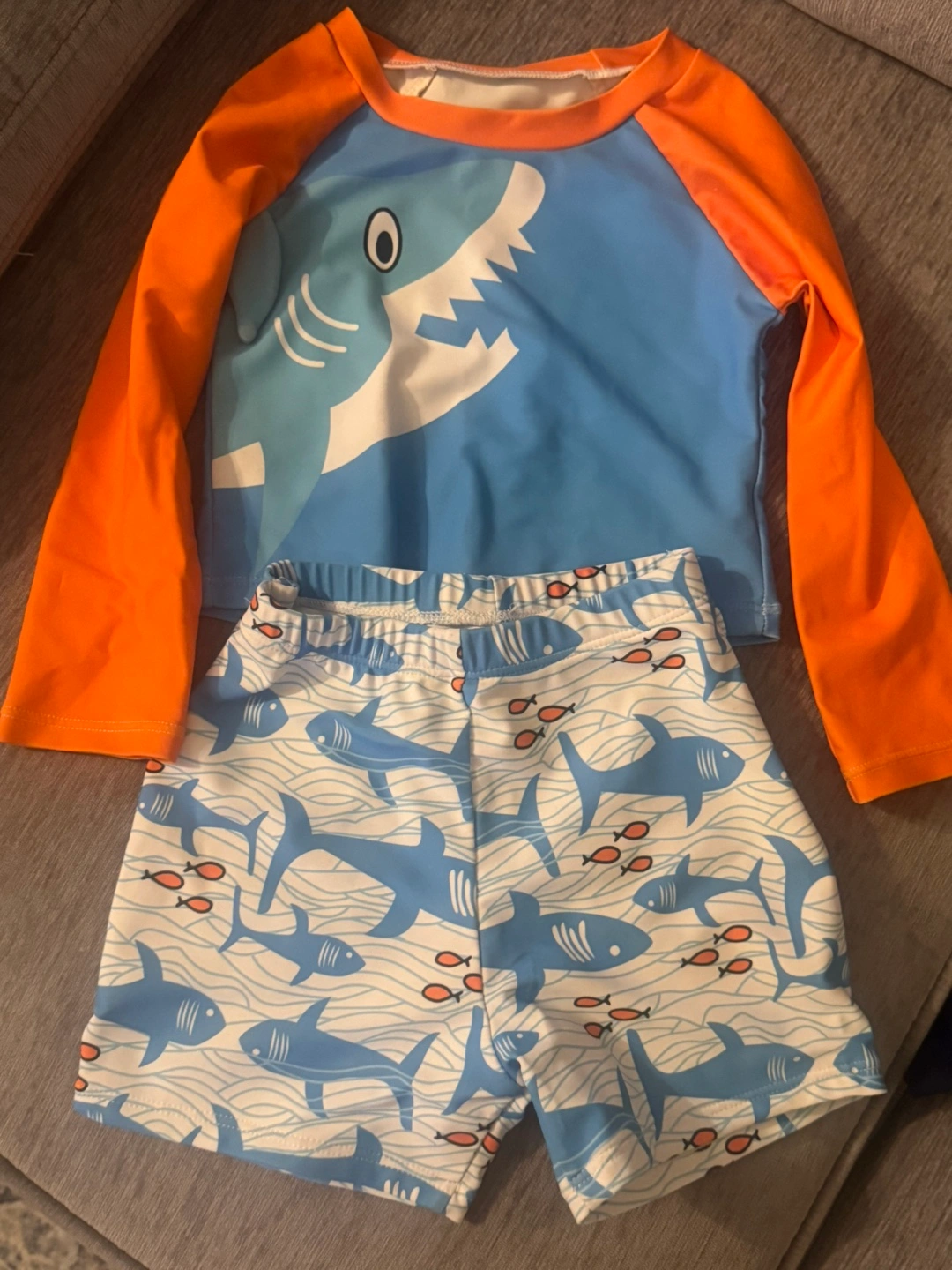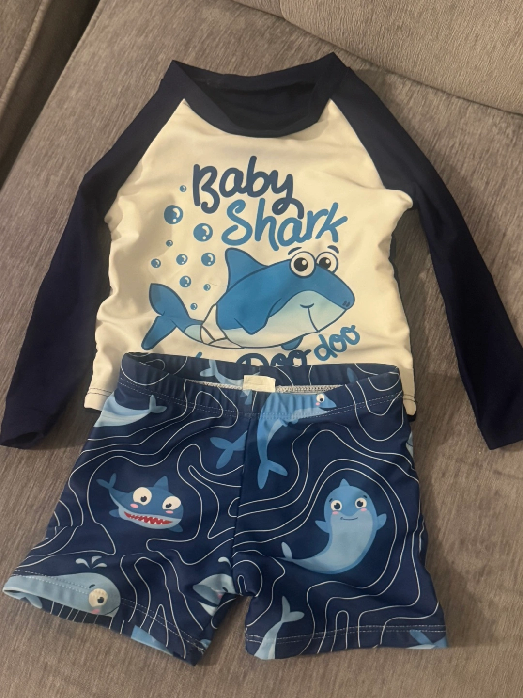 Two-piece baby swimsuit set. Features a long-sleeve rash guard and swim shorts. Cute shark designs. Perfect for summer fun.