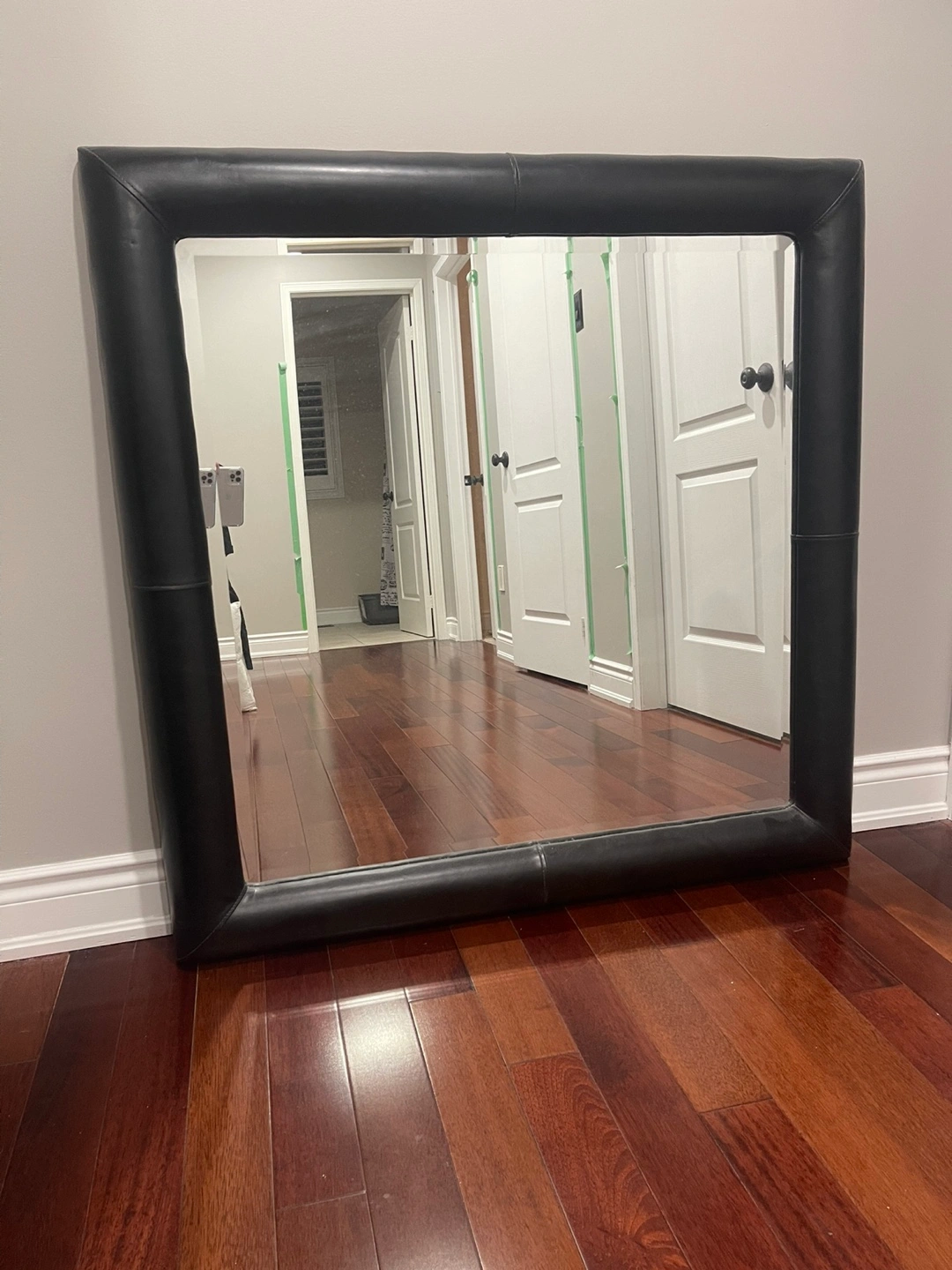 Large square mirror. Black leather frame. Excellent condition. Perfect for a hallway or bedroom.