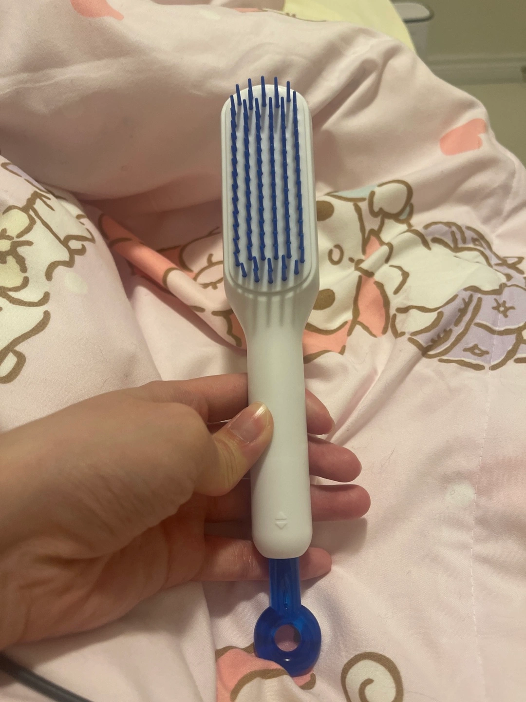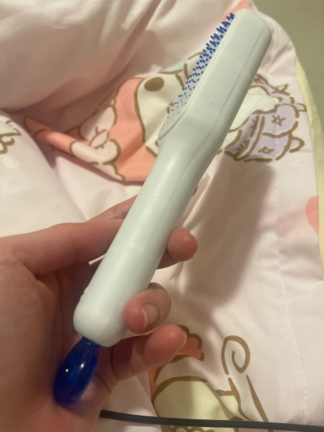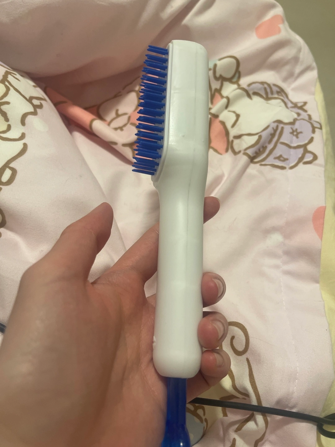 White plastic scalp massager. Blue bristles and handle. Great for stimulating the scalp.