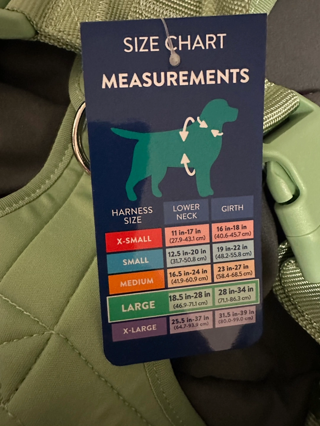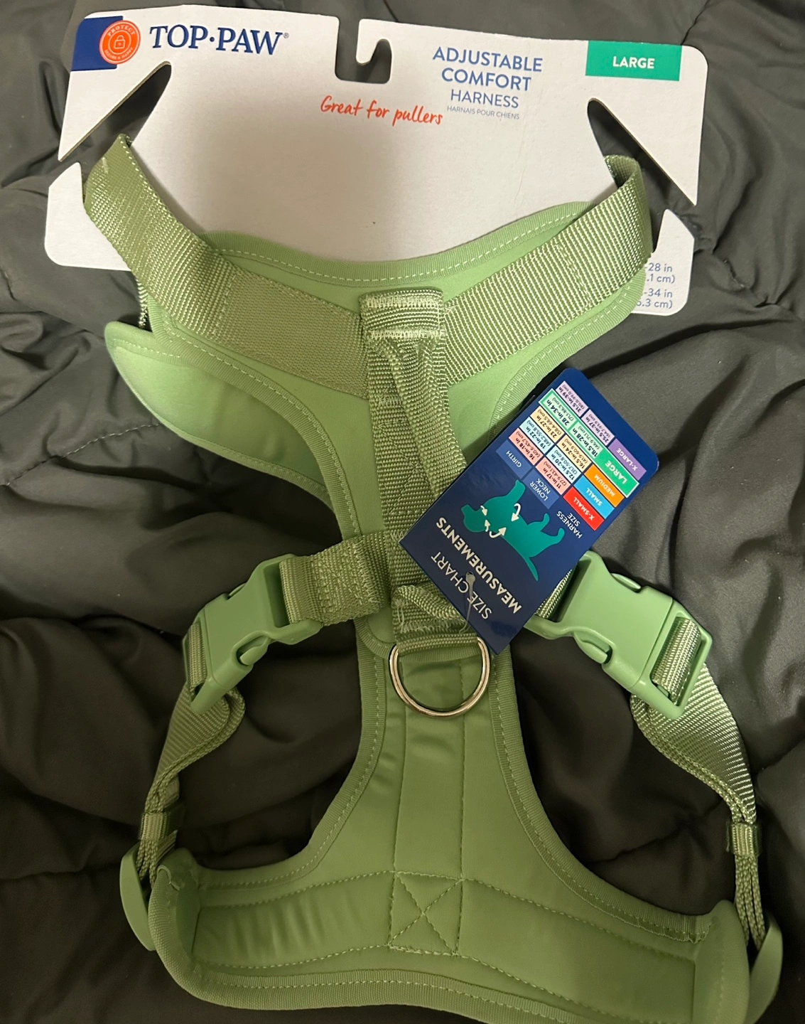Adjustable comfort harness for dogs. Size large. Great for pullers. Green colour. Includes size chart and measurement instructions.