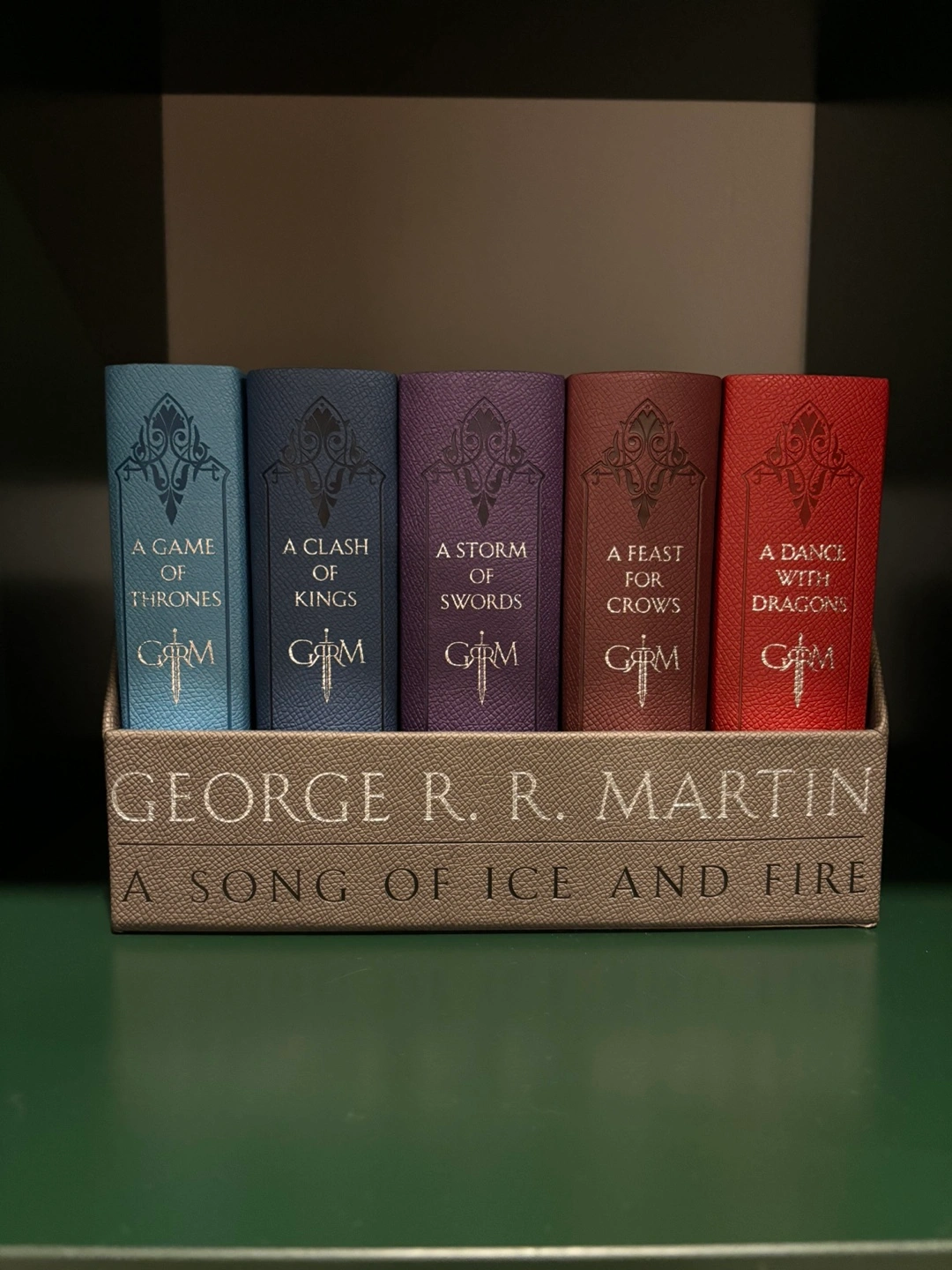 Five book boxed set. Includes A Game of Thrones, A Clash of Kings, A Storm of Swords, A Feast for Crows, and A Dance with Dragons. Collector's edition.