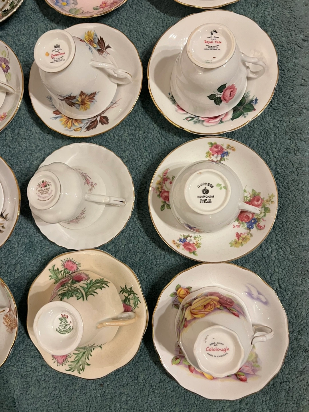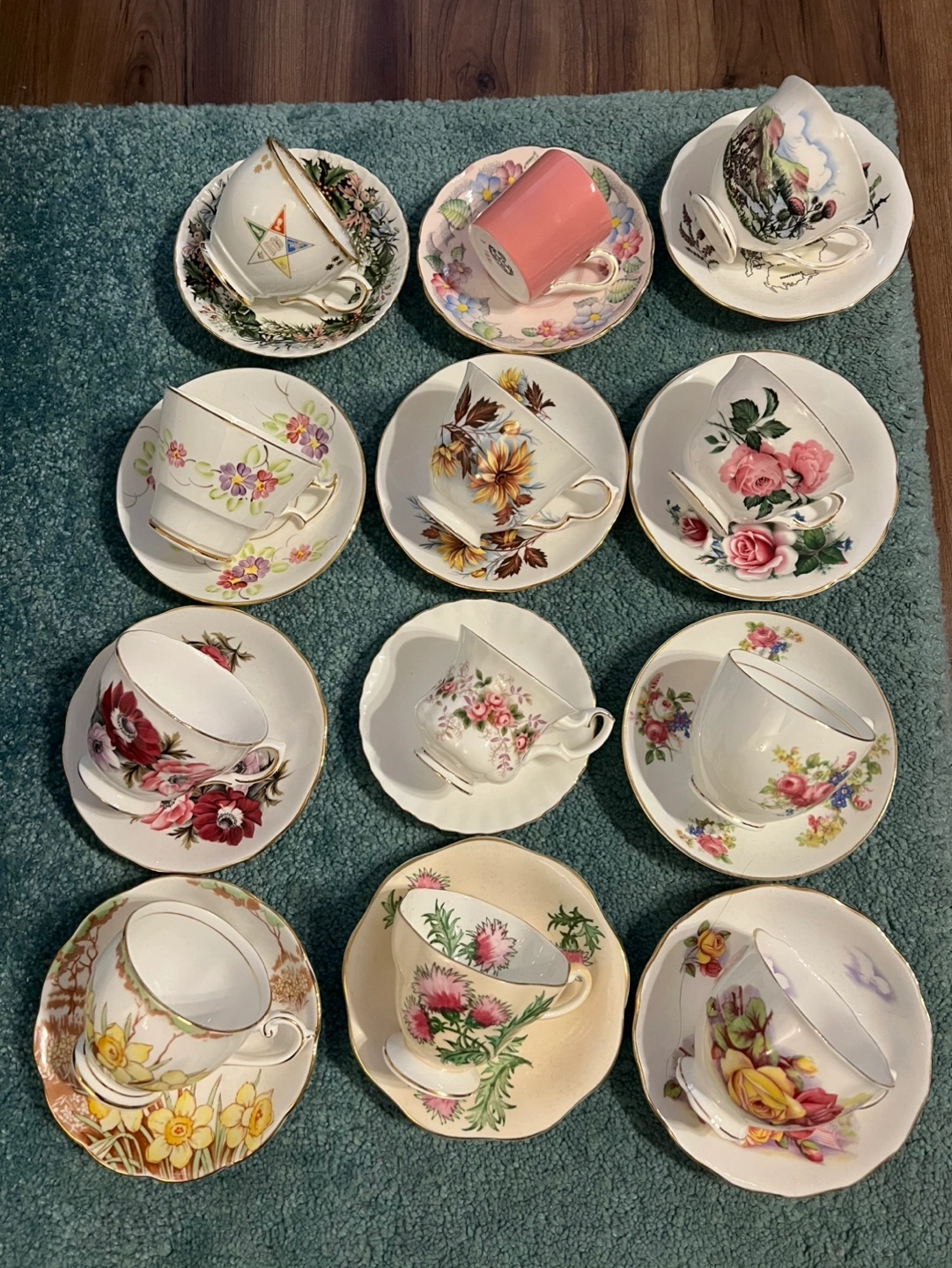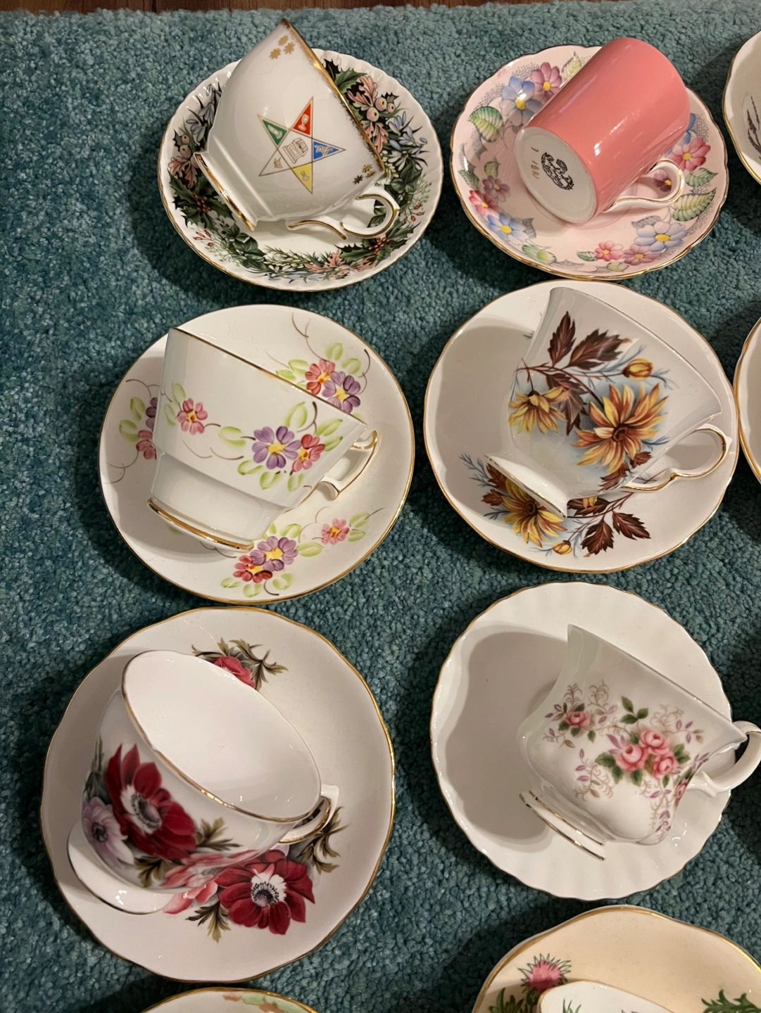 Lovely assortment of vintage teacups and saucers. Floral and other designs. Gold trim. Perfect for collectors or tea parties.