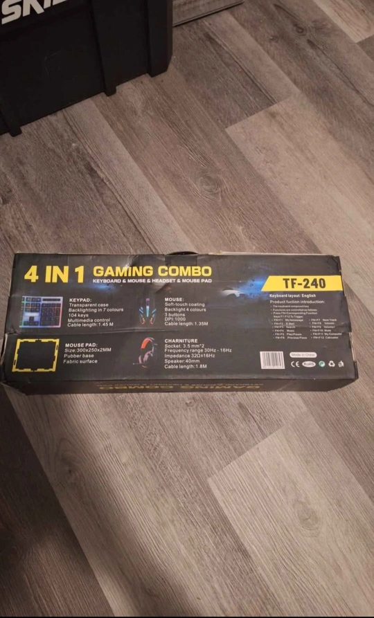 New, 4-in-1 gaming combo. Includes keyboard, mouse, headset, and mousepad. Backlit keyboard and mouse. Ergonomic design.