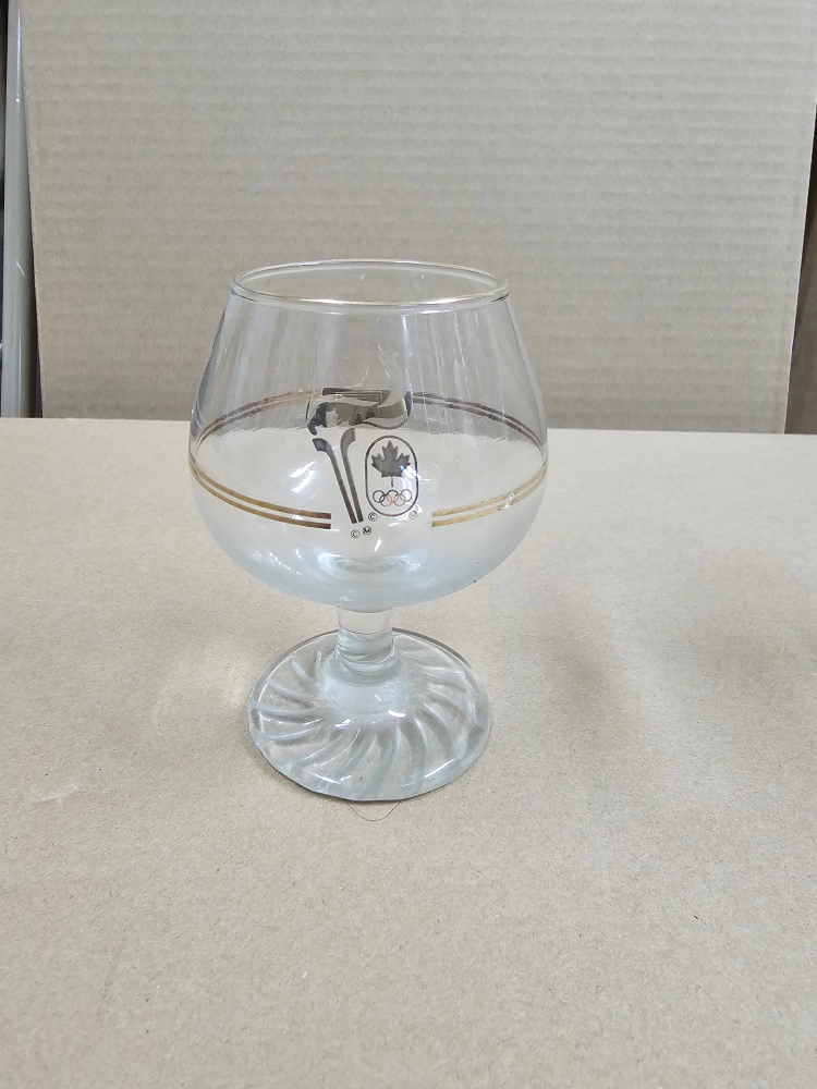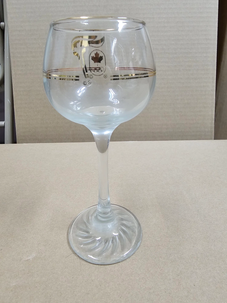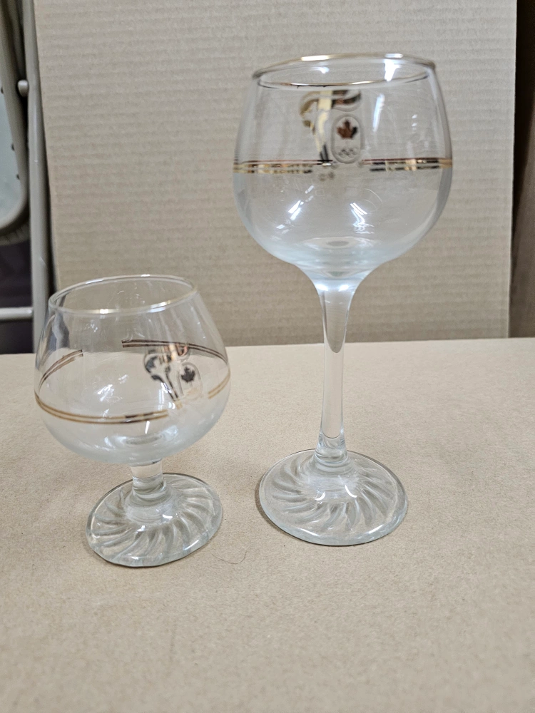 Vintage wine glasses. Commemorative design featuring the 1988 Calgary Olympics logo. Gold accents around the bowl. One type is a standard wine glass, the other is a smaller, brandy glass style.