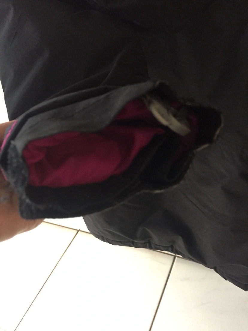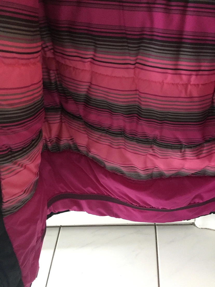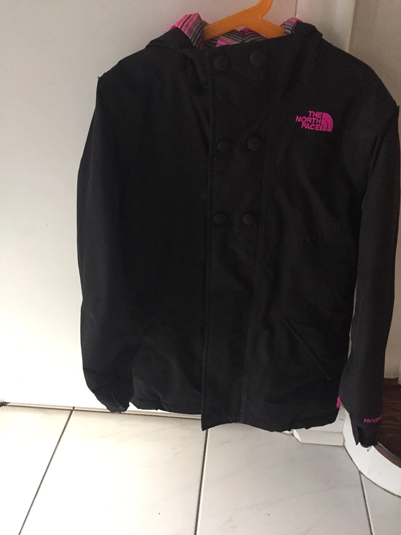 Black girls' ski jacket. Size medium (10/12). Pink and grey striped interior. Features a hood. Button closure. Used condition and shows some wear. Please refer to pictures for jacket details and condition of use.