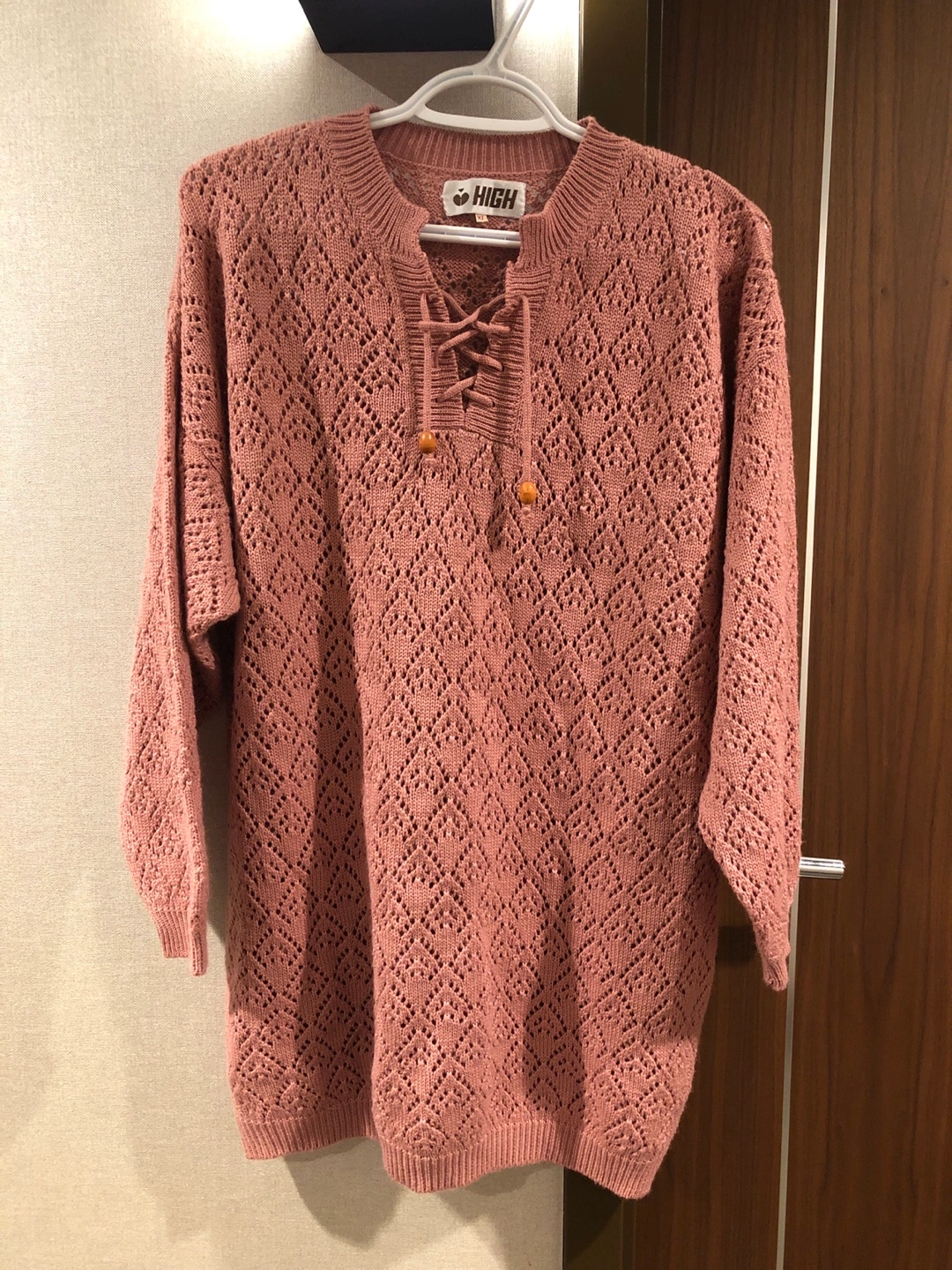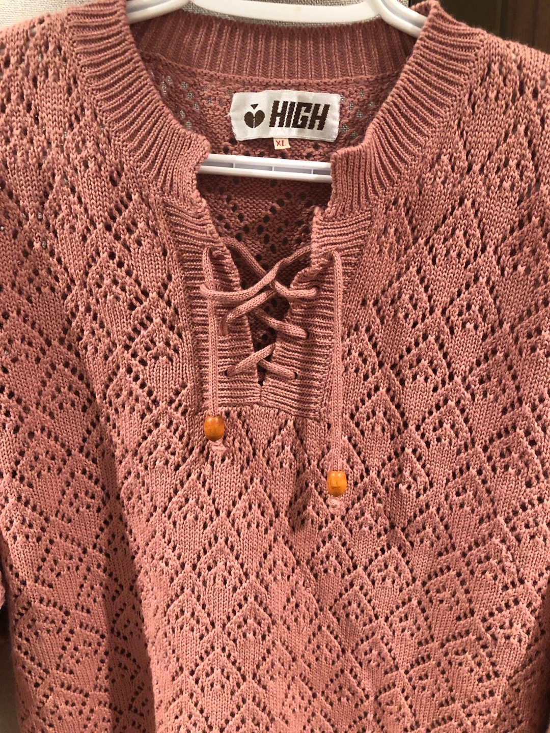 Lovely dusty rose-coloured sweater. Features an intricate knit pattern and a unique lace-up detail at the neckline. Three-quarter sleeves.
