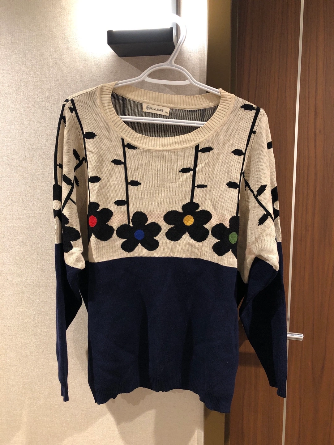 Cute cream and navy blue knit sweater. Features a floral design. Long sleeves. Crew neck.