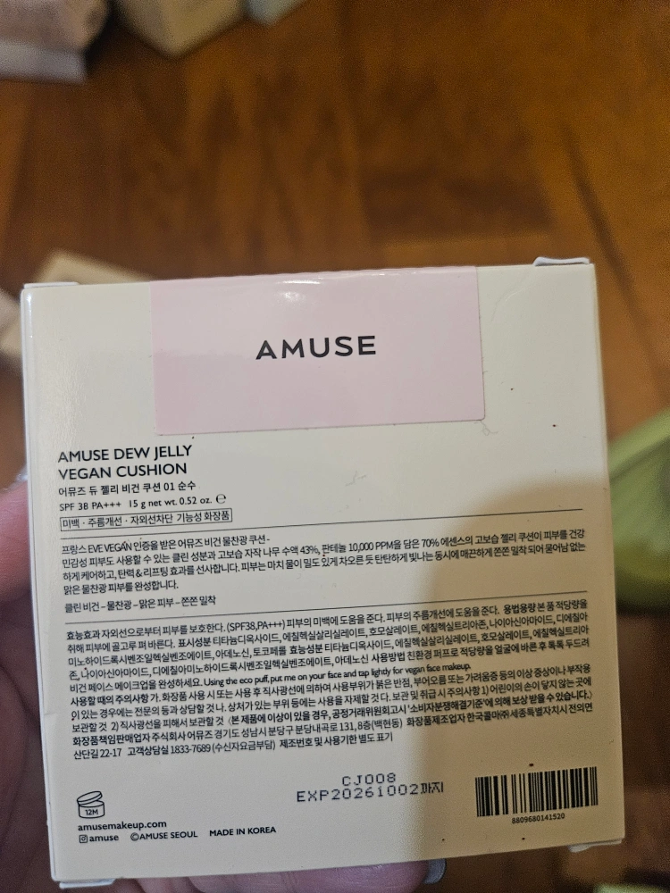 AMUSE Dew Jelly Vegan Cushion. SPF 38 PA+++. 15g net wt. 0.52 oz. e. Made in Korea. Vegan.