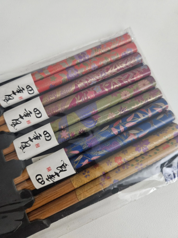 Five pairs of elegant chopsticks. Bamboo chopsticks with decorative paper wraps. Perfect for special guests. New, in original packaging.