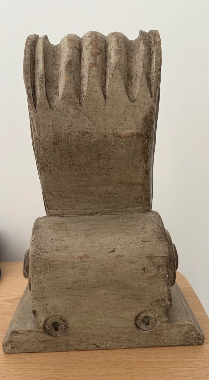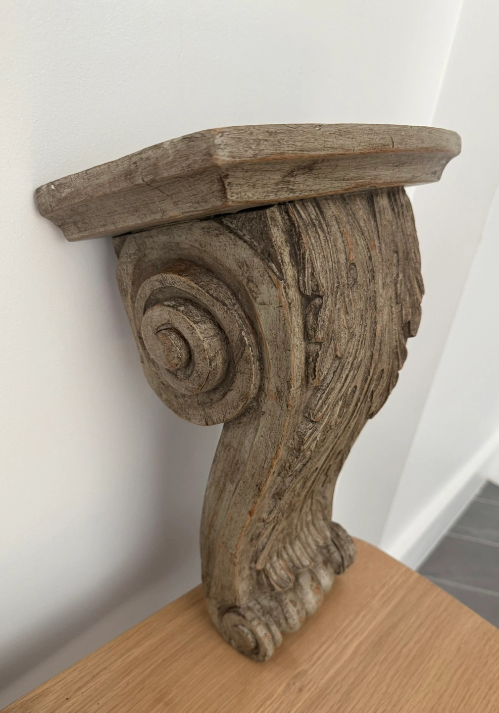 Hand-carved wooden corbel. Features intricate scrollwork and leaf detailing. Tan/Grey finish. Suitable for shelf support, to hang on wall or decorative purposes.