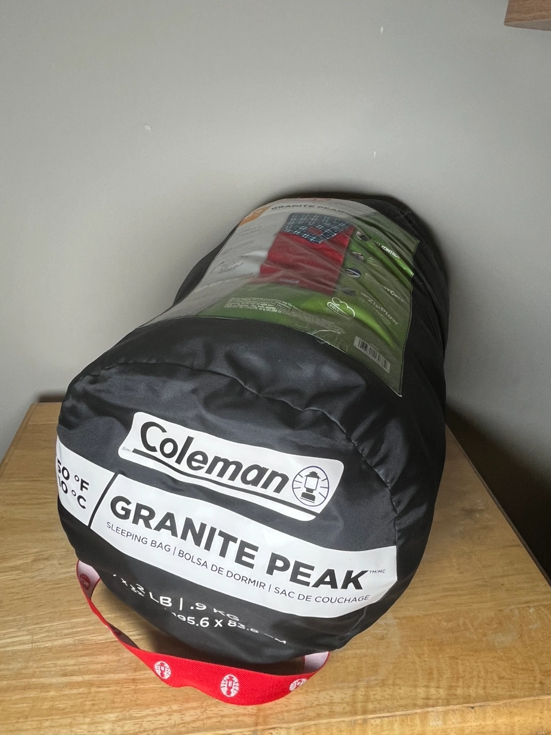 339Coleman Granite Peak sleeping bag. Red and blue plaid. ZipPlow zipper. 2 lb, 77 x 33 inches. 50°F / 10°C rating. Stuff sack included. Used once.
