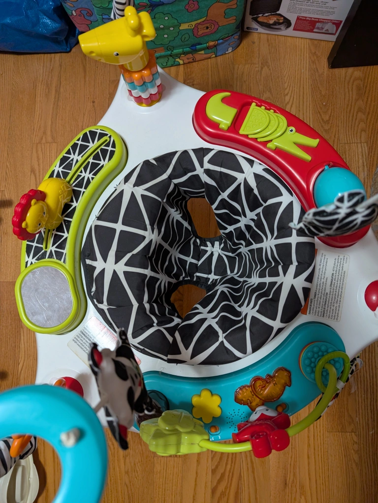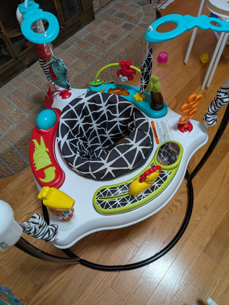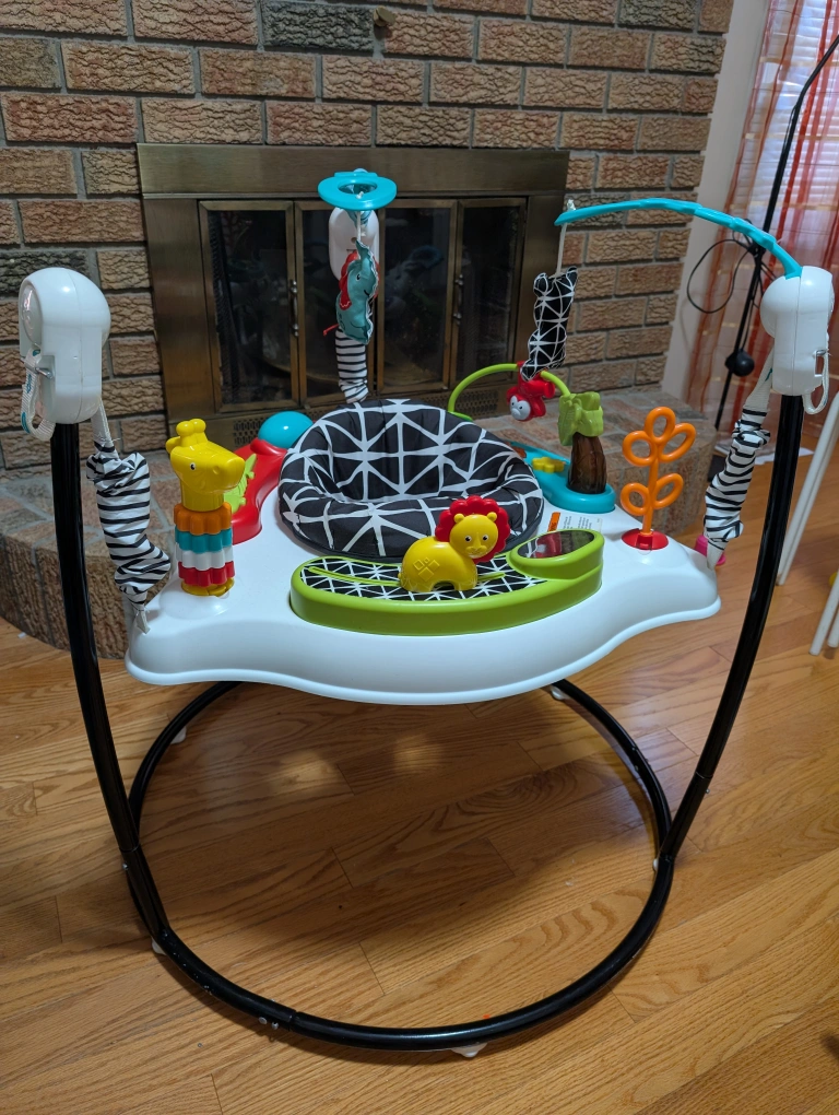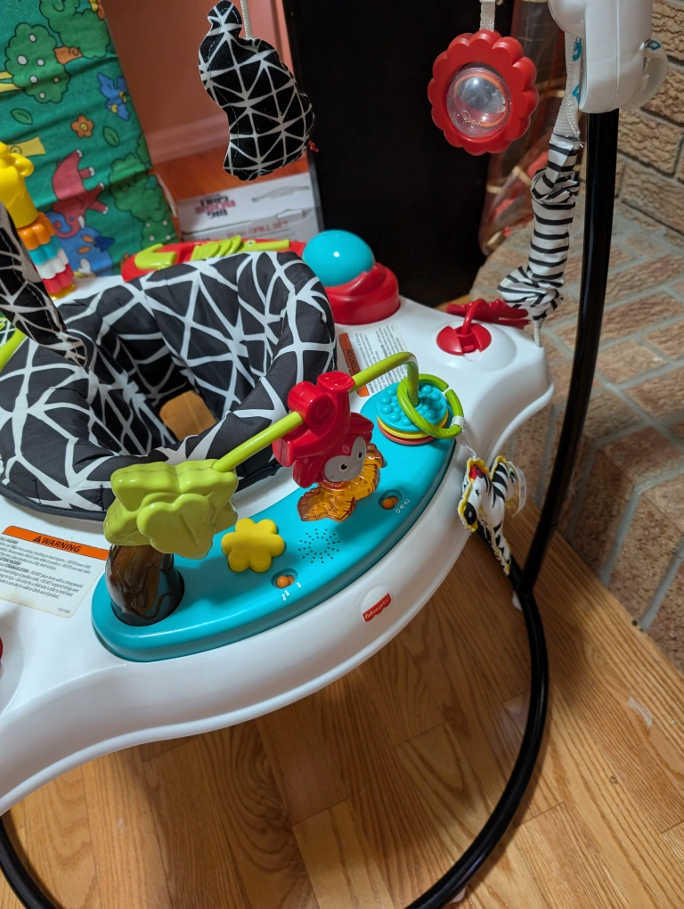 1000+Infant jumperoo. Features multiple toys and activities. Black and white patterned seat. Great for encouraging development.