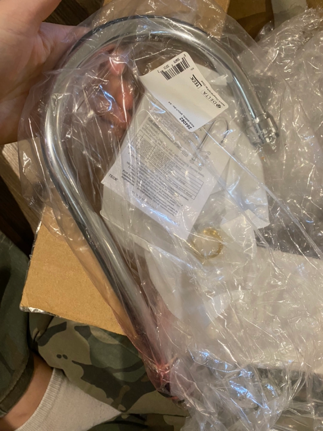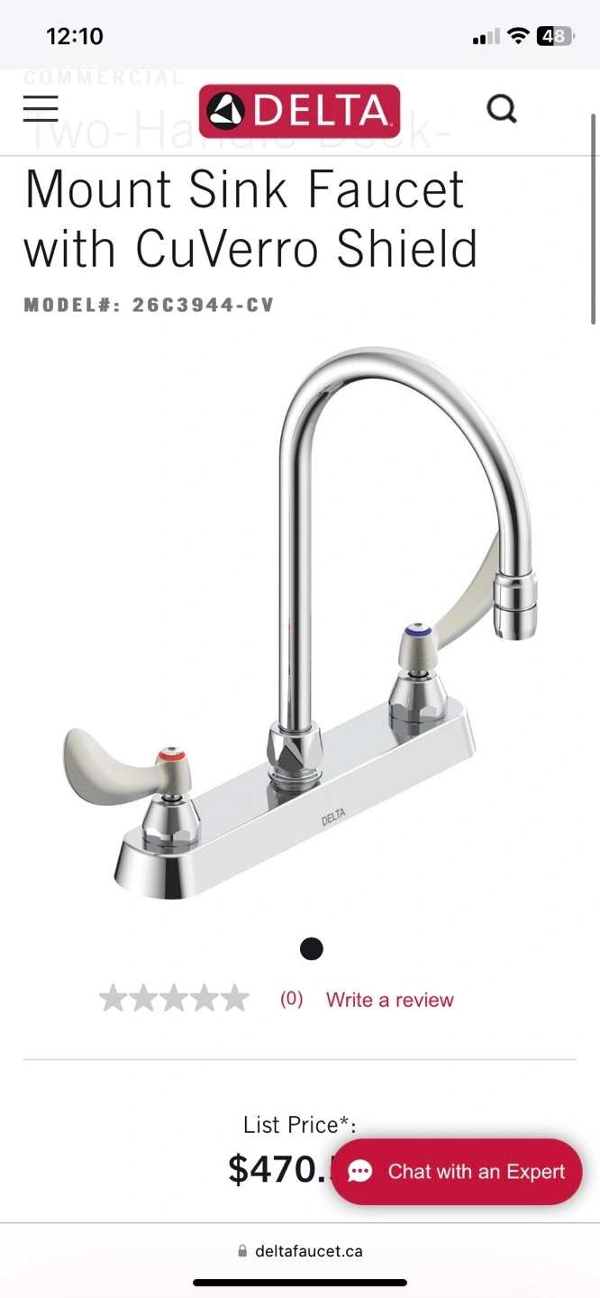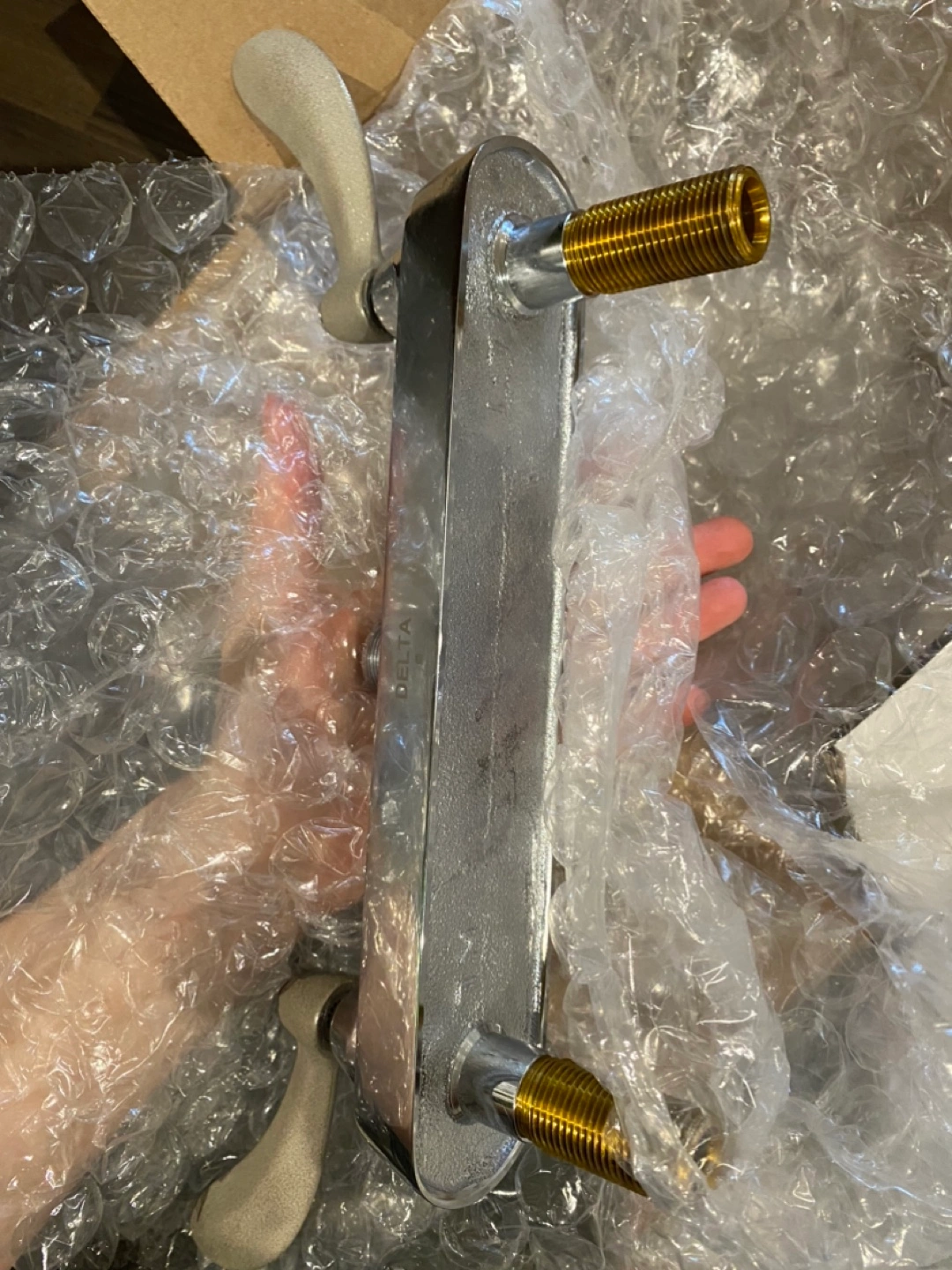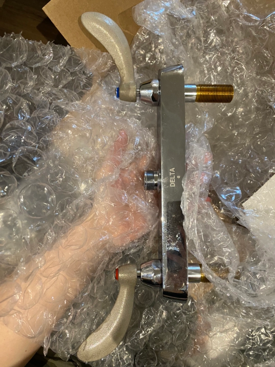 New in box, Delta faucet. Chrome finish. Two handles. 8 inch deck mount. Includes spout. Model 26C3944-CV. CuVerro antimicrobial protection.