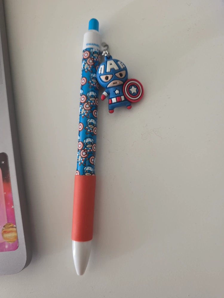 Cute pen featuring Captain America design. Orange grip section. Includes a small Captain America charm. Great for Marvel fans or collectors. New item, only tested on paper to see the color. It is a black color ink. Otherwise new and unused. Fixed price.