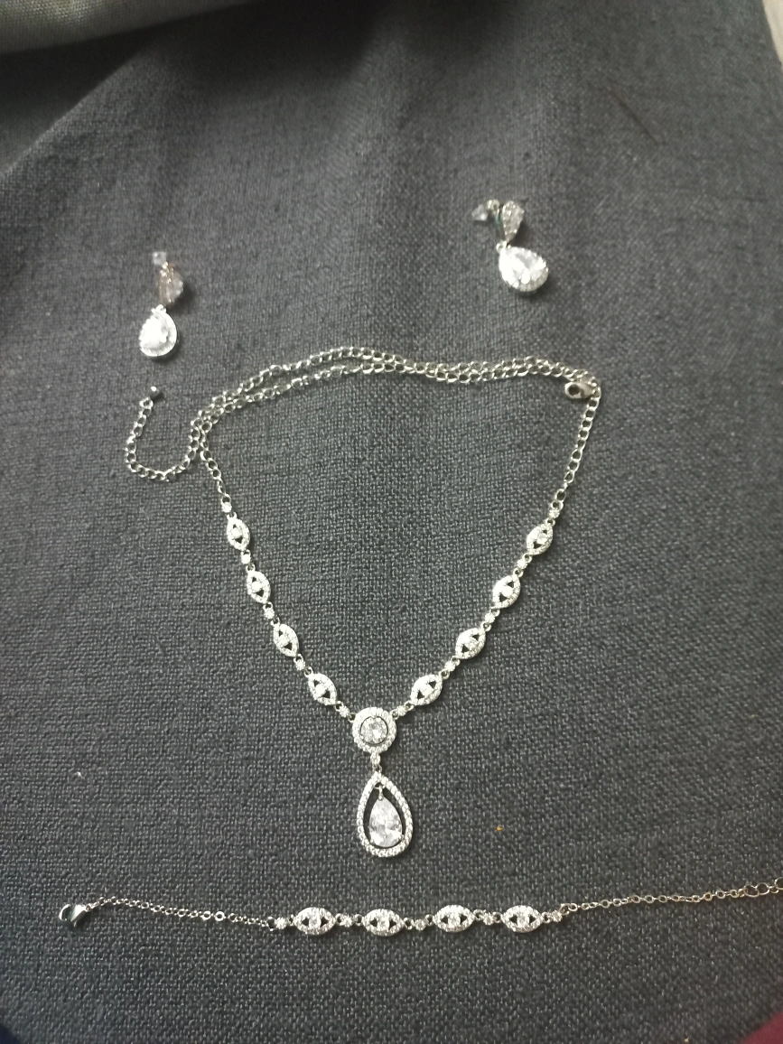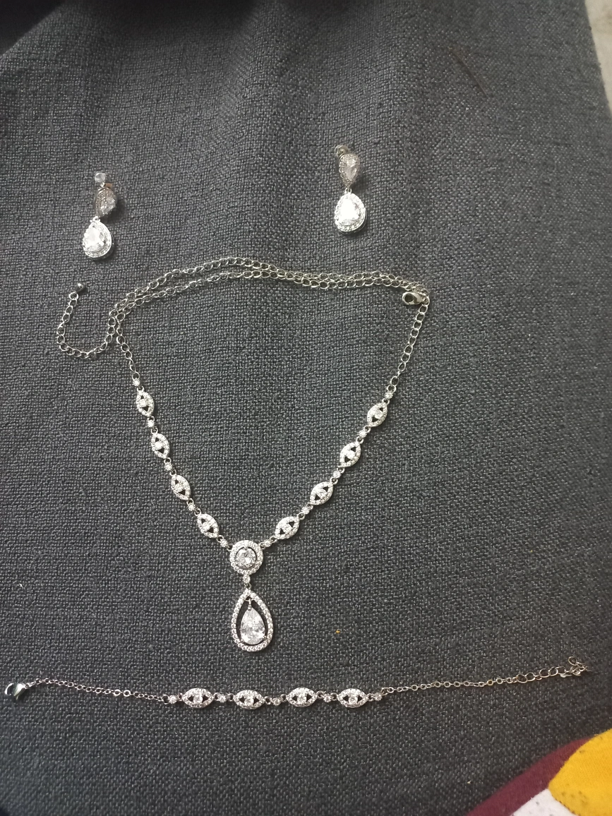 Elegant bridal jewelry set. Includes necklace, earrings, and bracelet. Silver-tone with clear rhinestones. Perfect for weddings or special occasions. never used. with box. Amazon price is $23 but here only $10.
