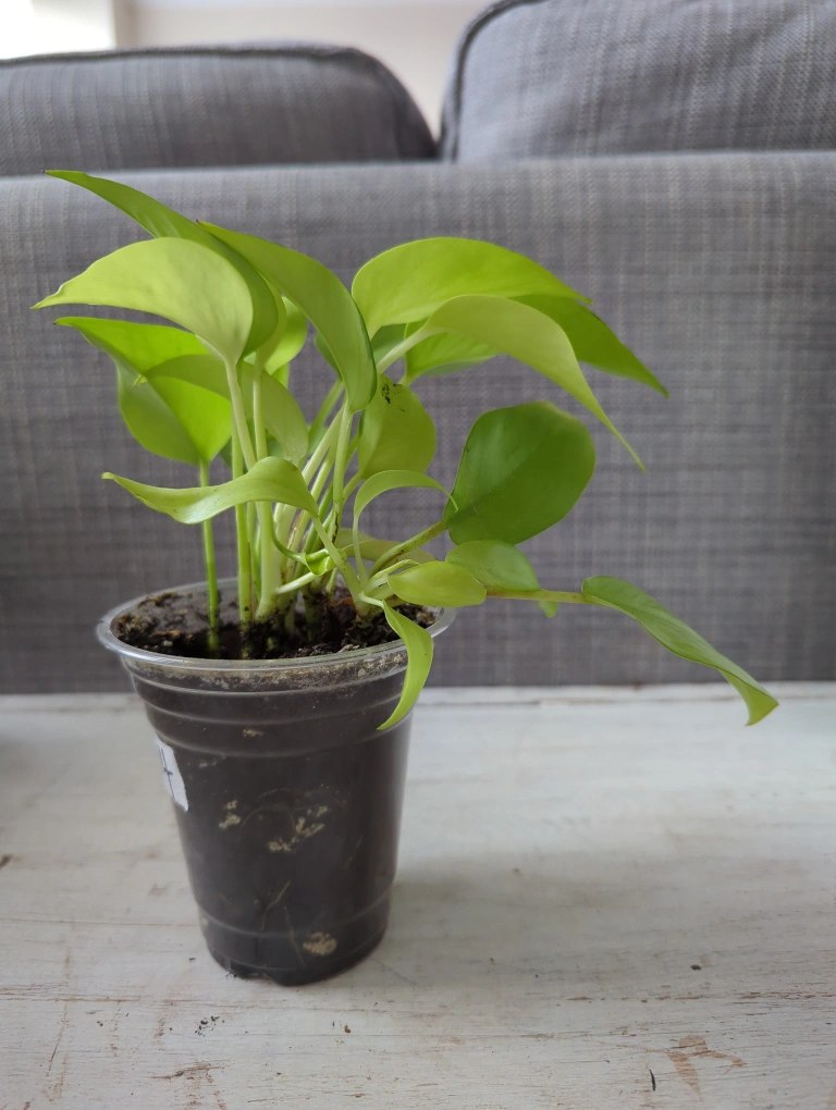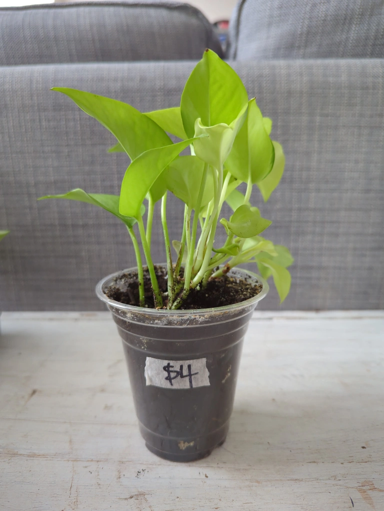Small neon pothos plant in a plastic pot. Great for Easy to care for, low light.