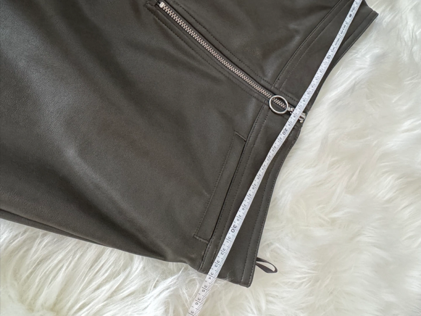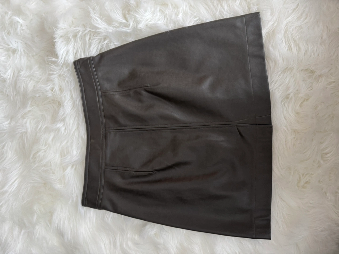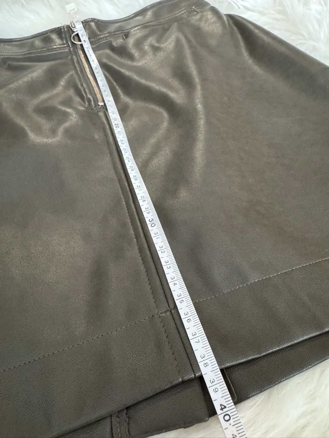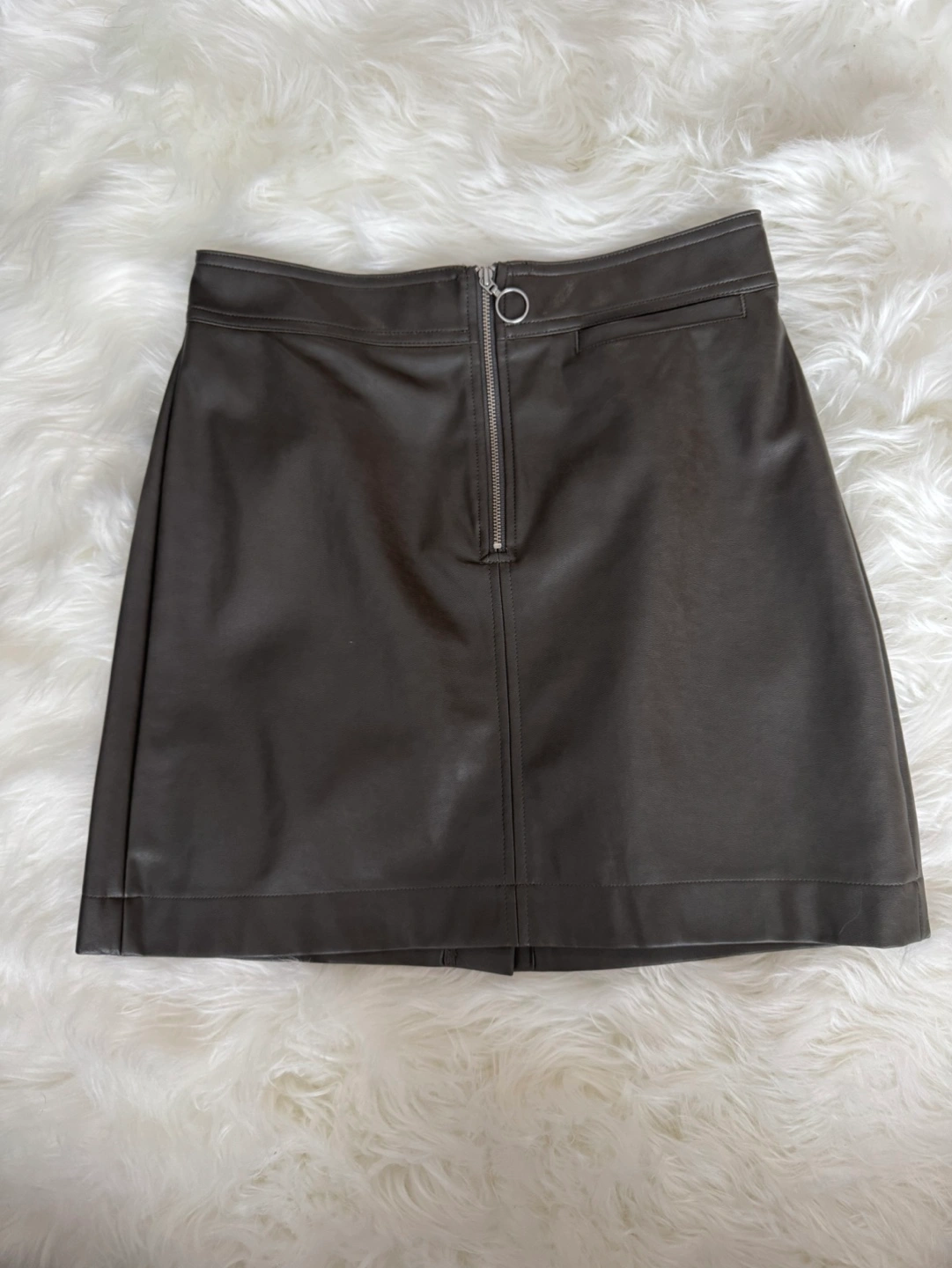 Dark olive green faux leather mini skirt. Features a zipper closure and a back pocket. Size 2.