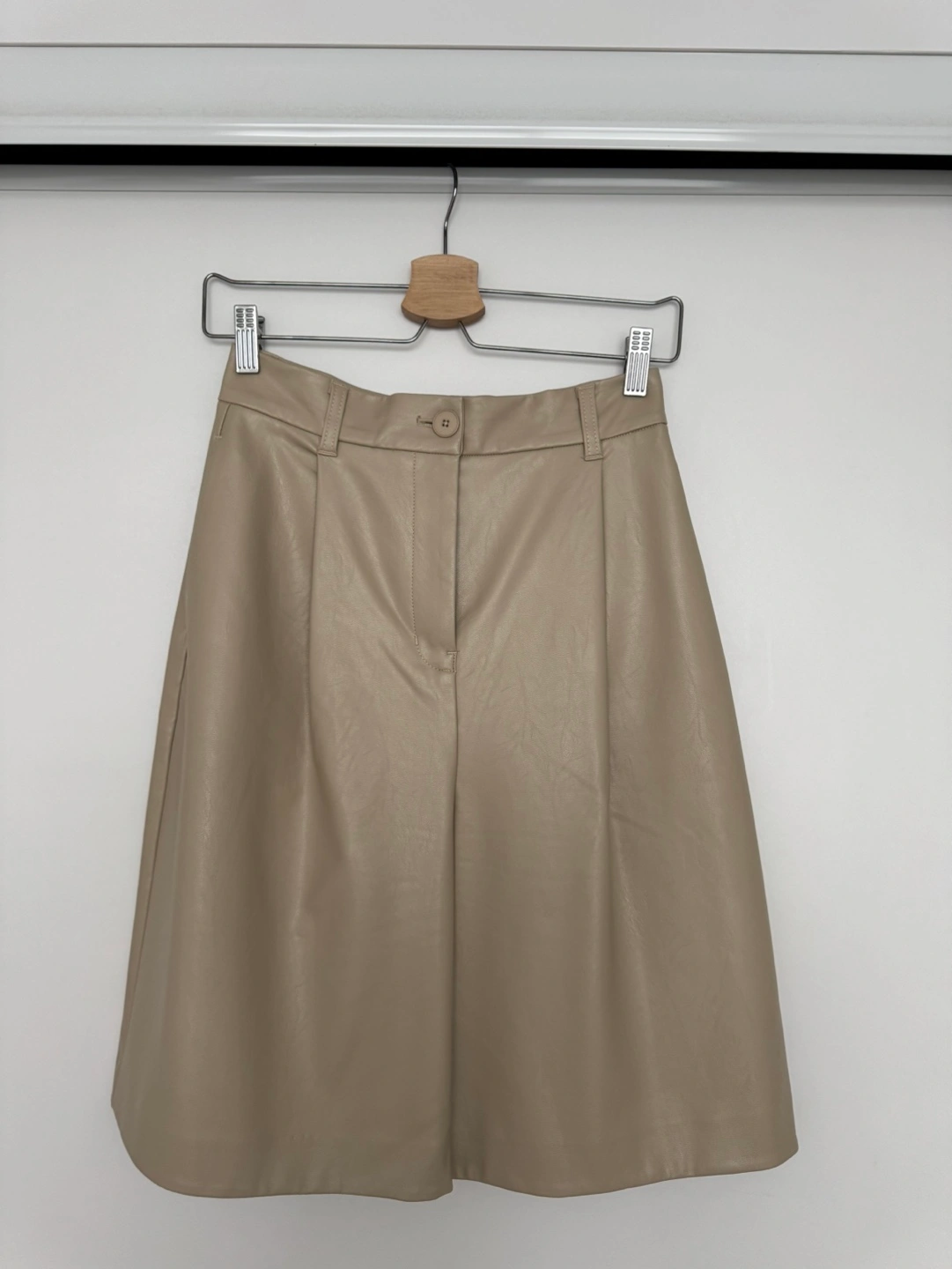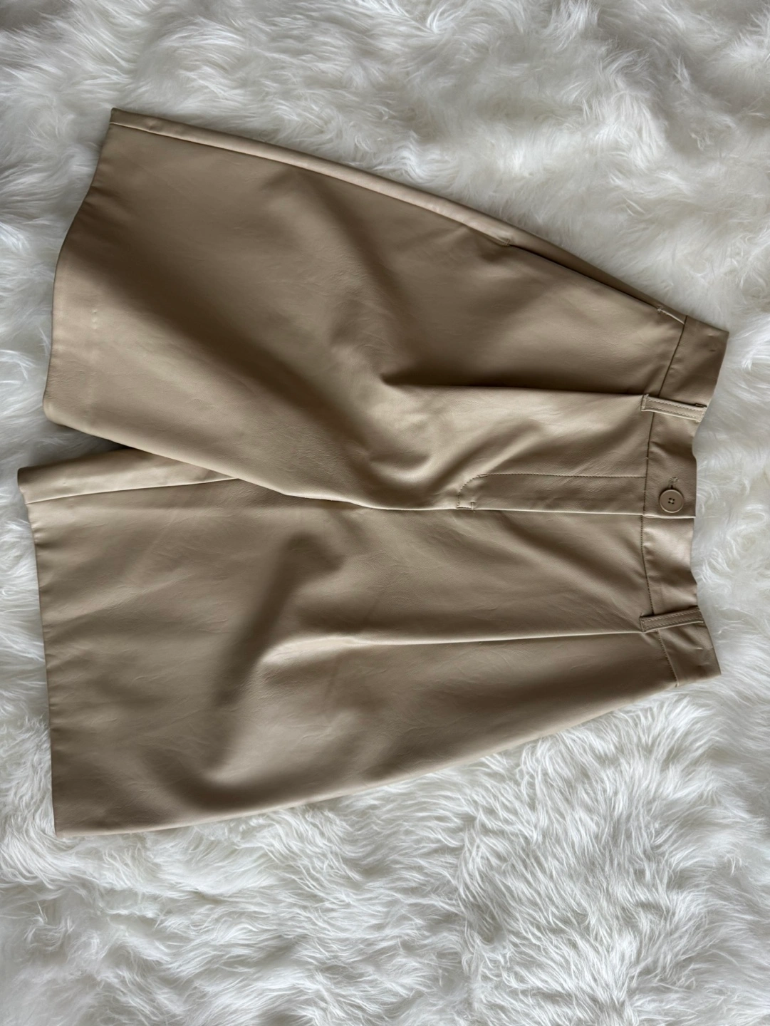 Beige faux leather shorts. High-waisted with pleats. Button and zipper closure. Great for pear shape.