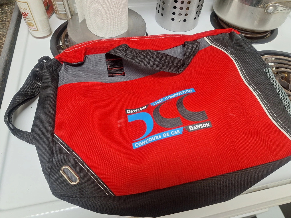 1000+Red and black bag. Features Dawson College Case Competition logo. Shoulder strap included. Great for carrying books or other items.