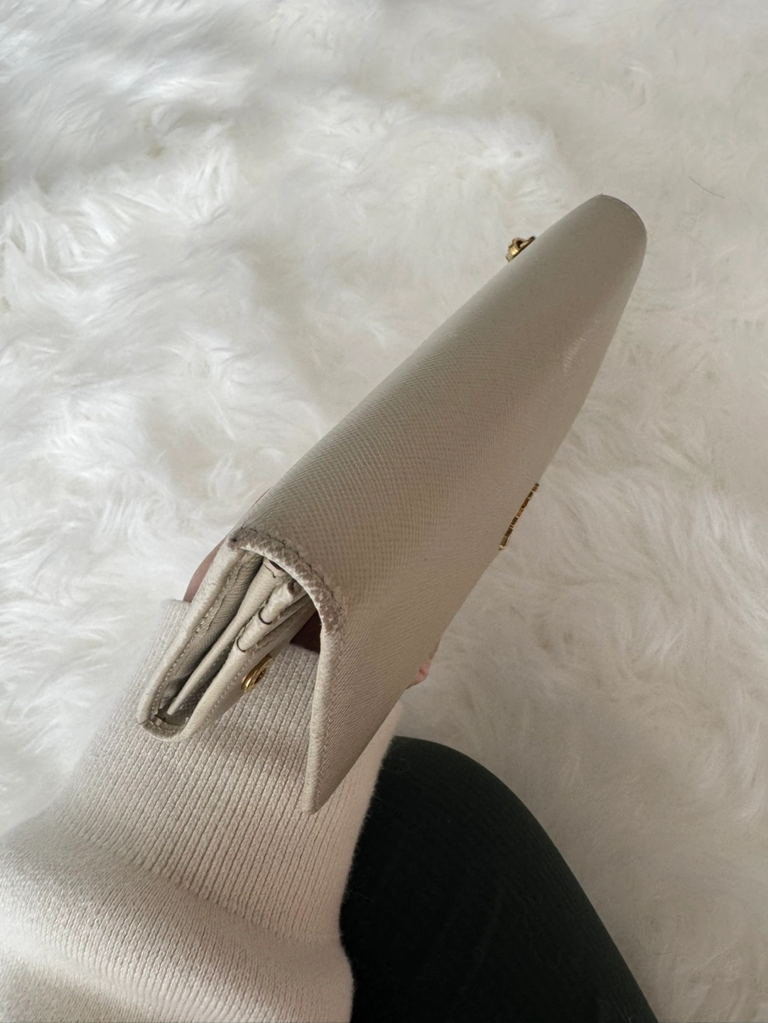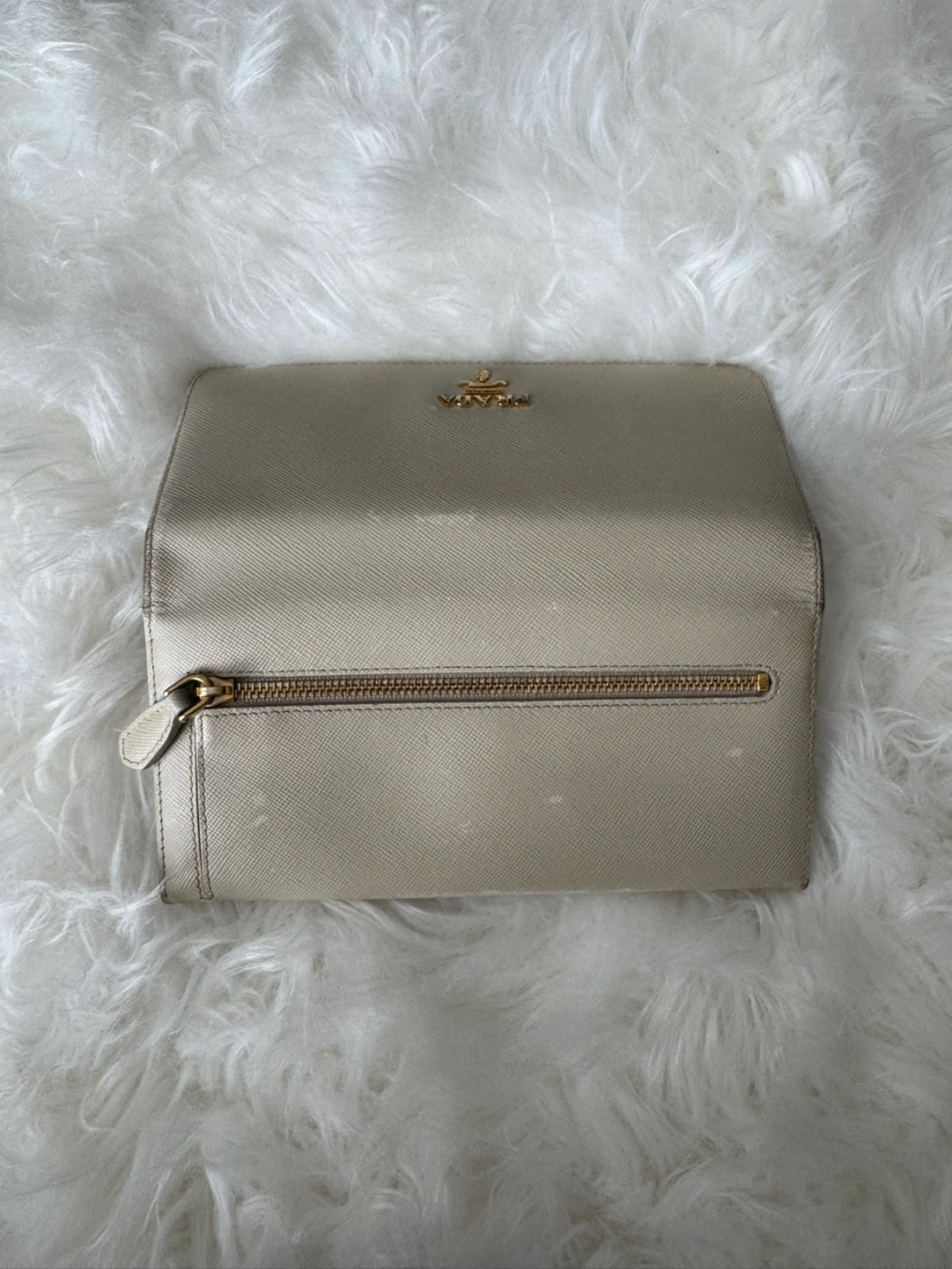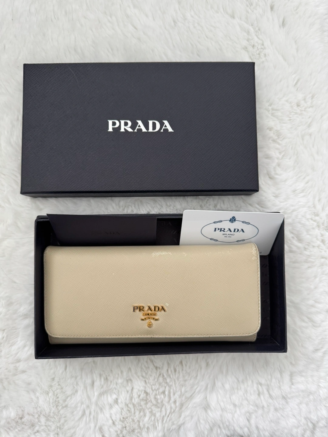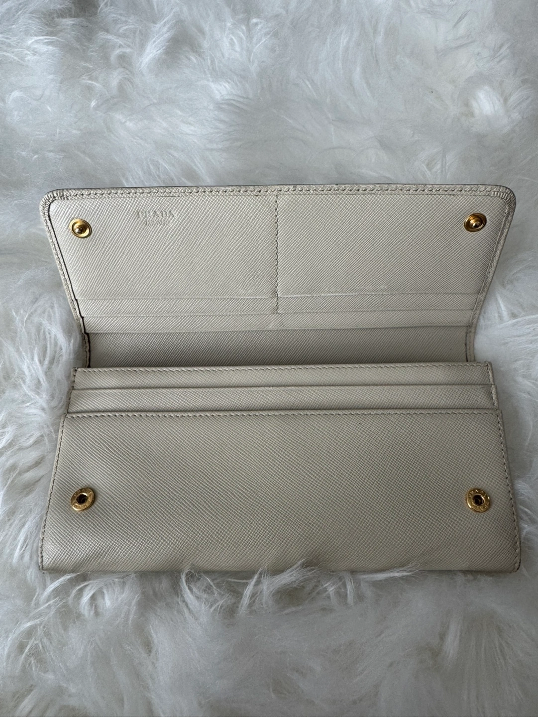 Authentic Prada wallet. Off-white Saffiano leather. Long wallet style. Gold-tone hardware. Includes box and authenticity card.