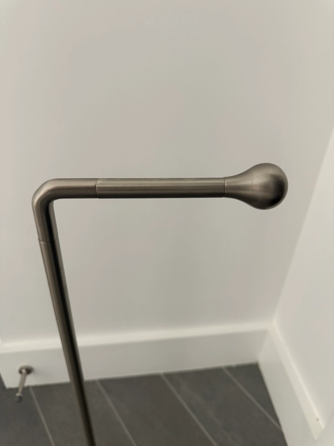 Modern freestanding toilet paper holder. Brushed nickel finish. Sleek and minimalist design. Perfect for any bathroom.