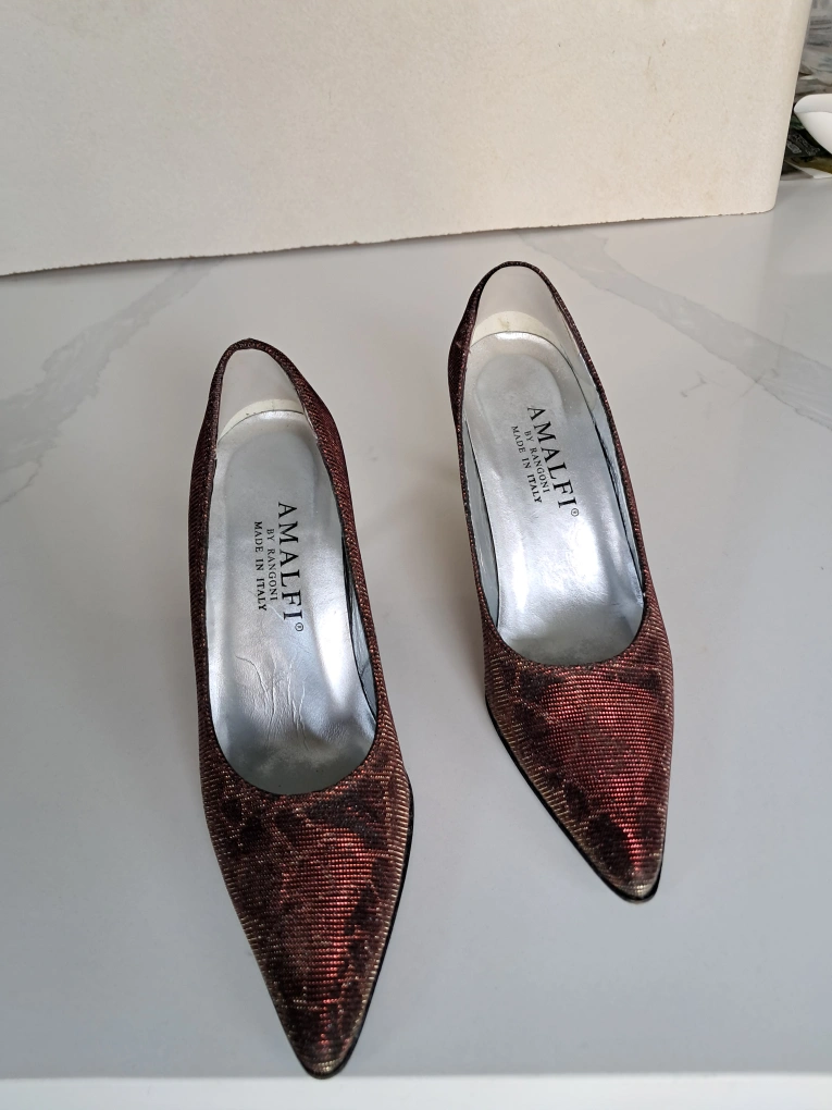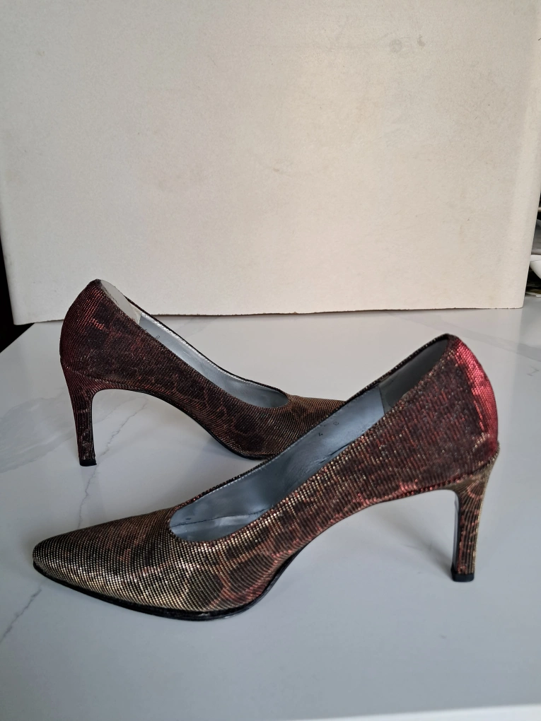 Women's dress shoes. Pointed-toe heels. Red and gold fabric upper. All Leather Made in Italy.