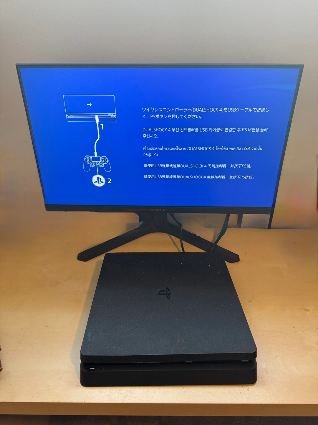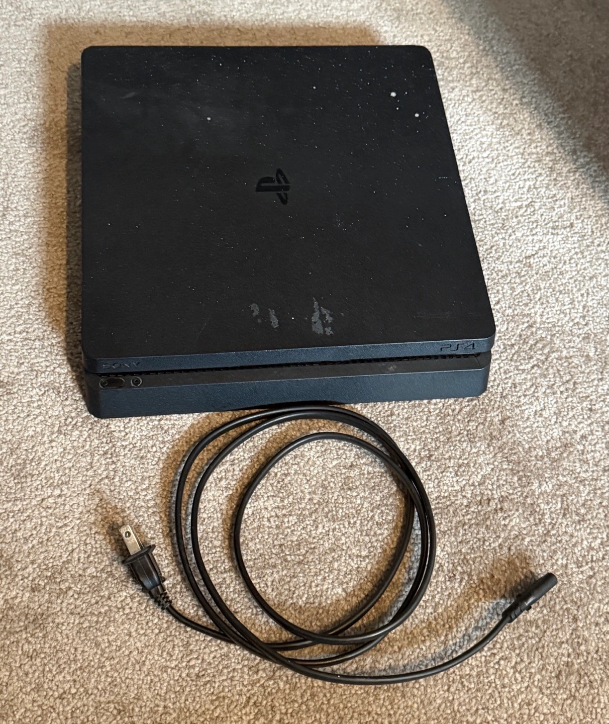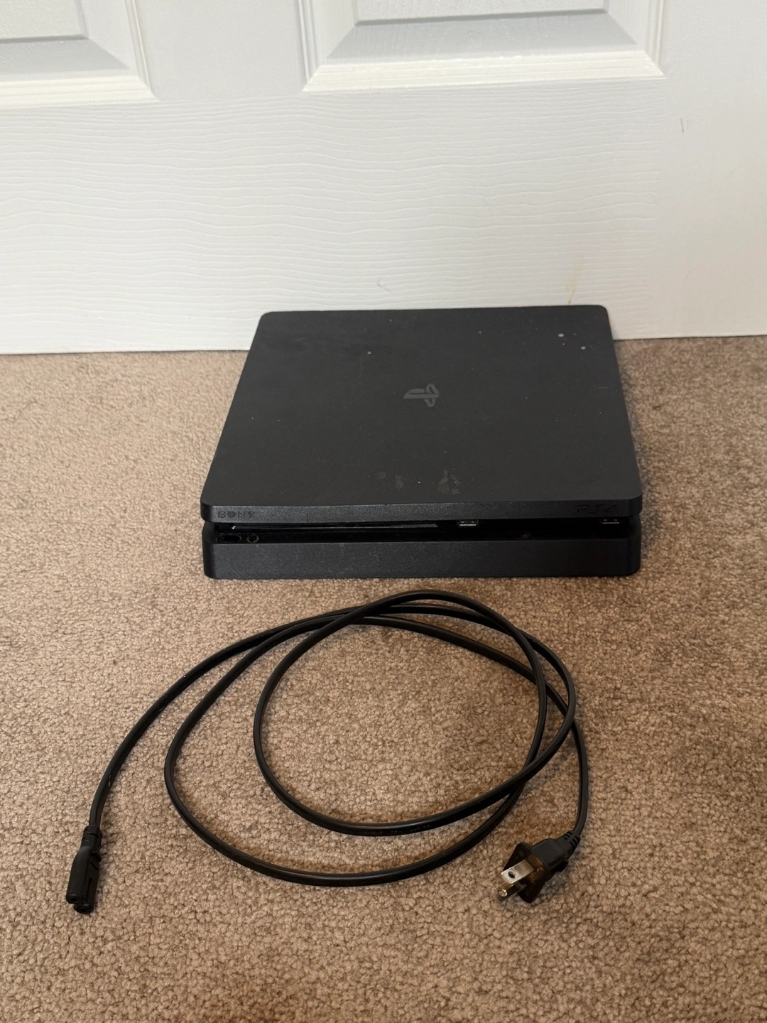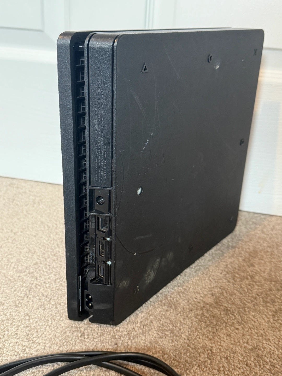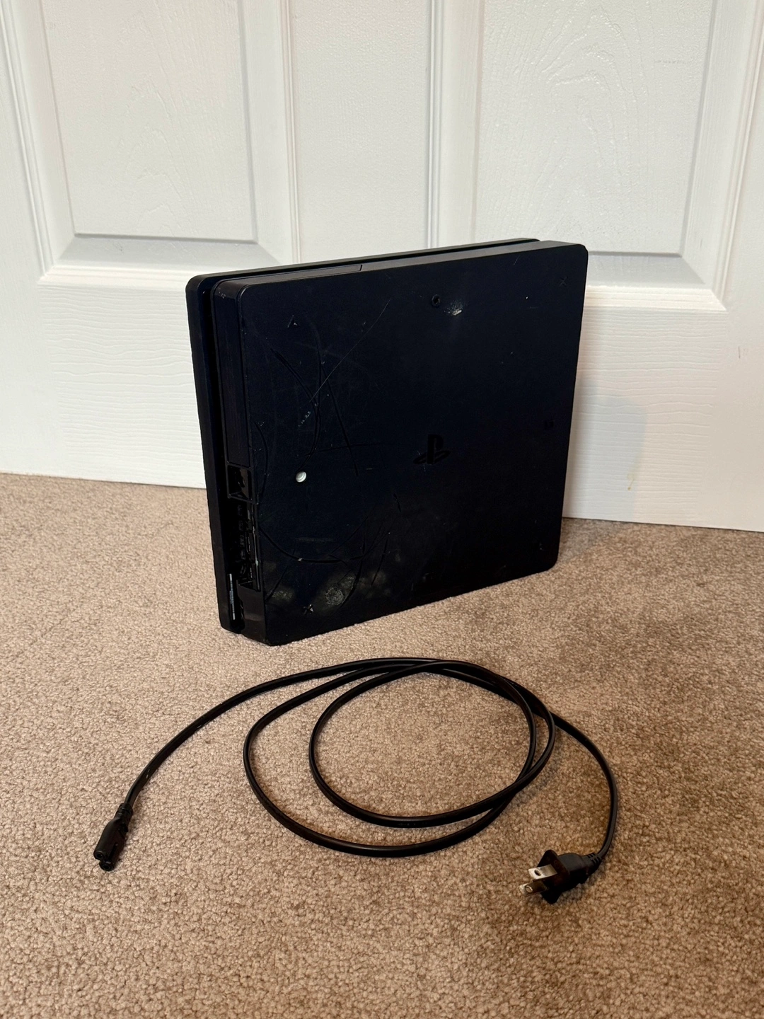 Pre-owned PlayStation 4 Slim console. Includes power cable. Scratches and scuffs present.