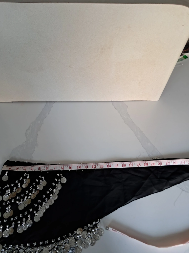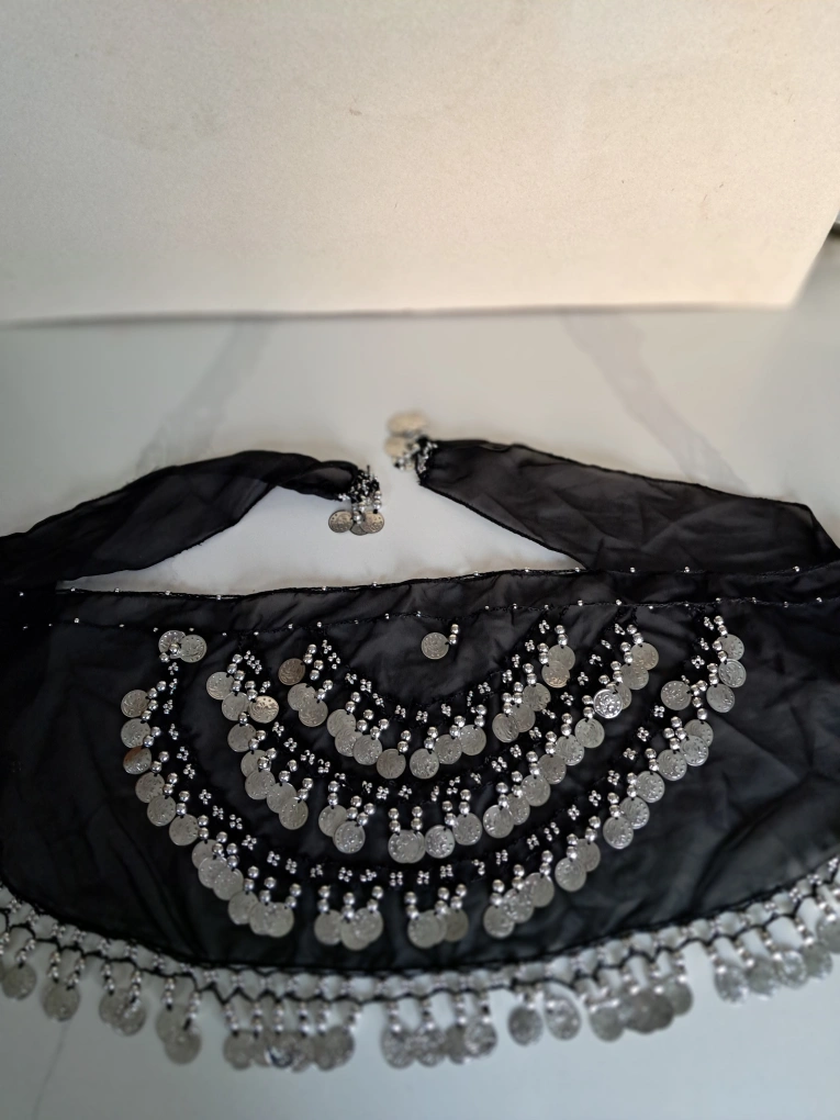 Black chiffon hip scarf. Features silver coin and bead embellishments. Approximately 56 inches long. Great for belly dancing or costume.