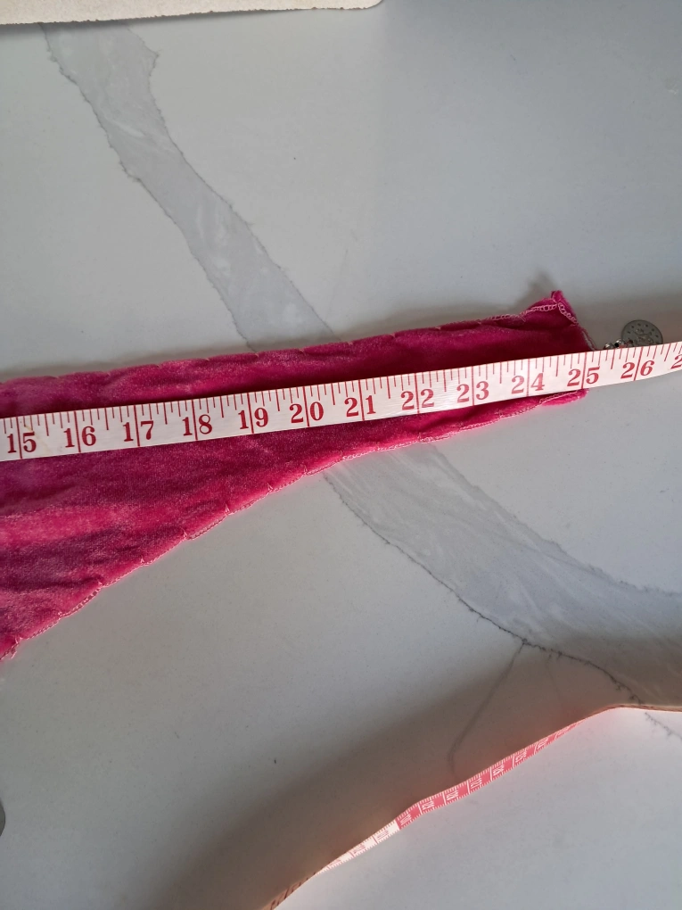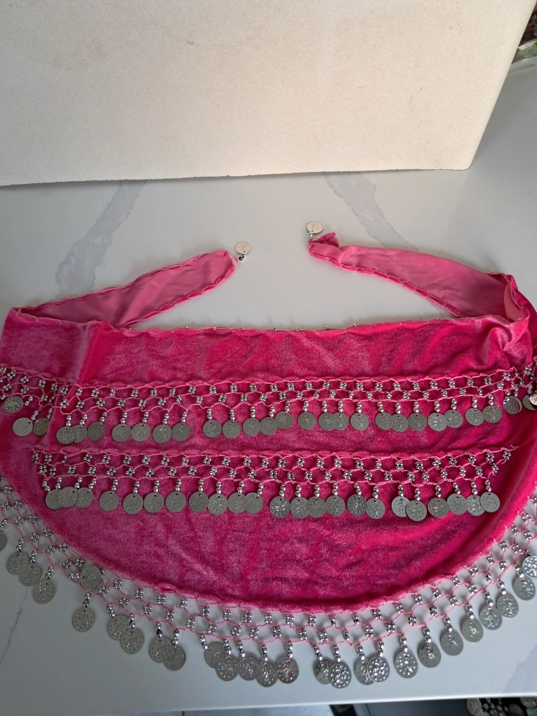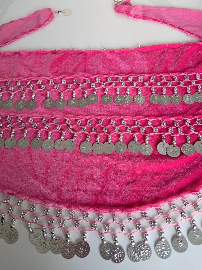 Pink velvet hip scarf. Features silver coin accents. Approximately 50 inches long. Great for belly dancing or costume.