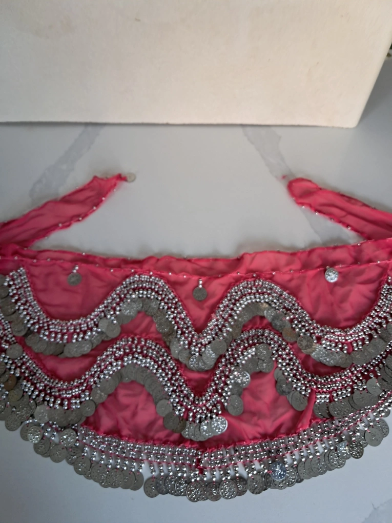 Beautiful pink belly dance hip scarf. Features silver coin accents. Approximately 45 inches long.