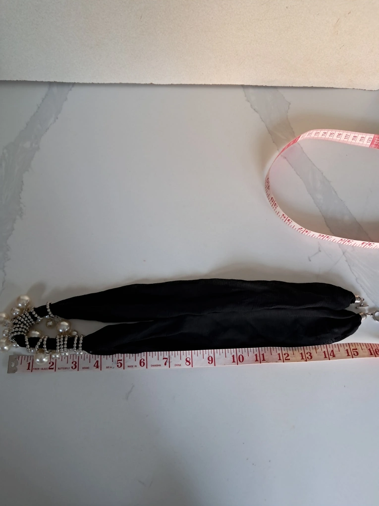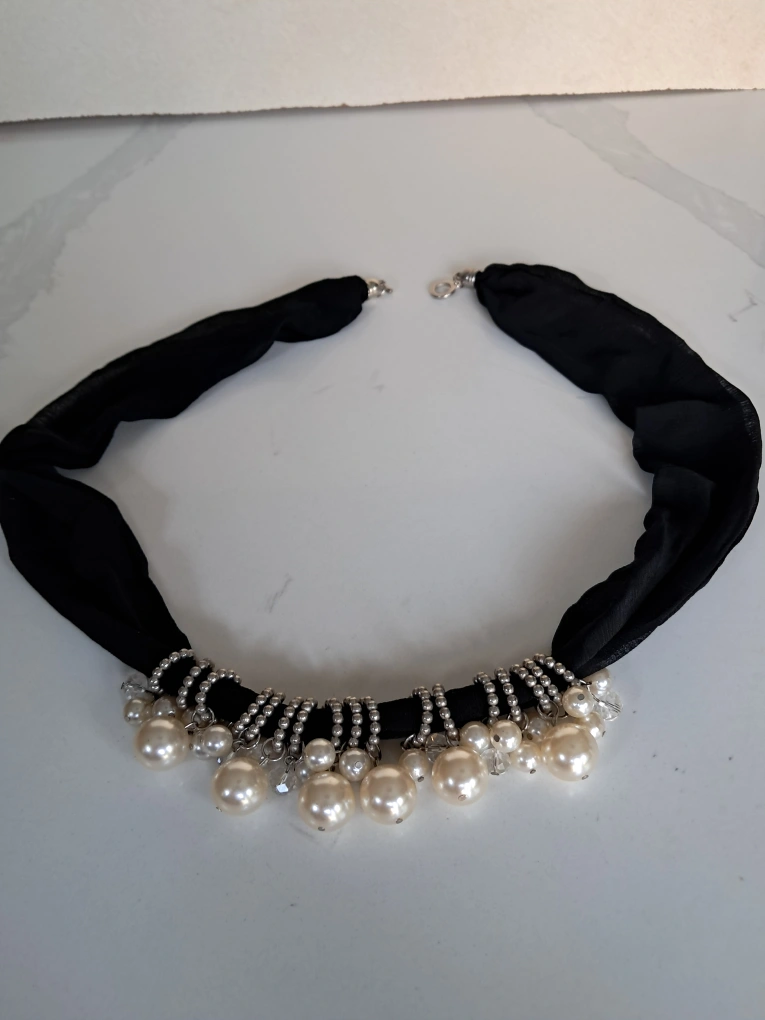 Beautiful statement necklace/choker Features a black fabric base with pearl and crystal embellishments. Toggle clasp closure. Approximately 30 inches long.