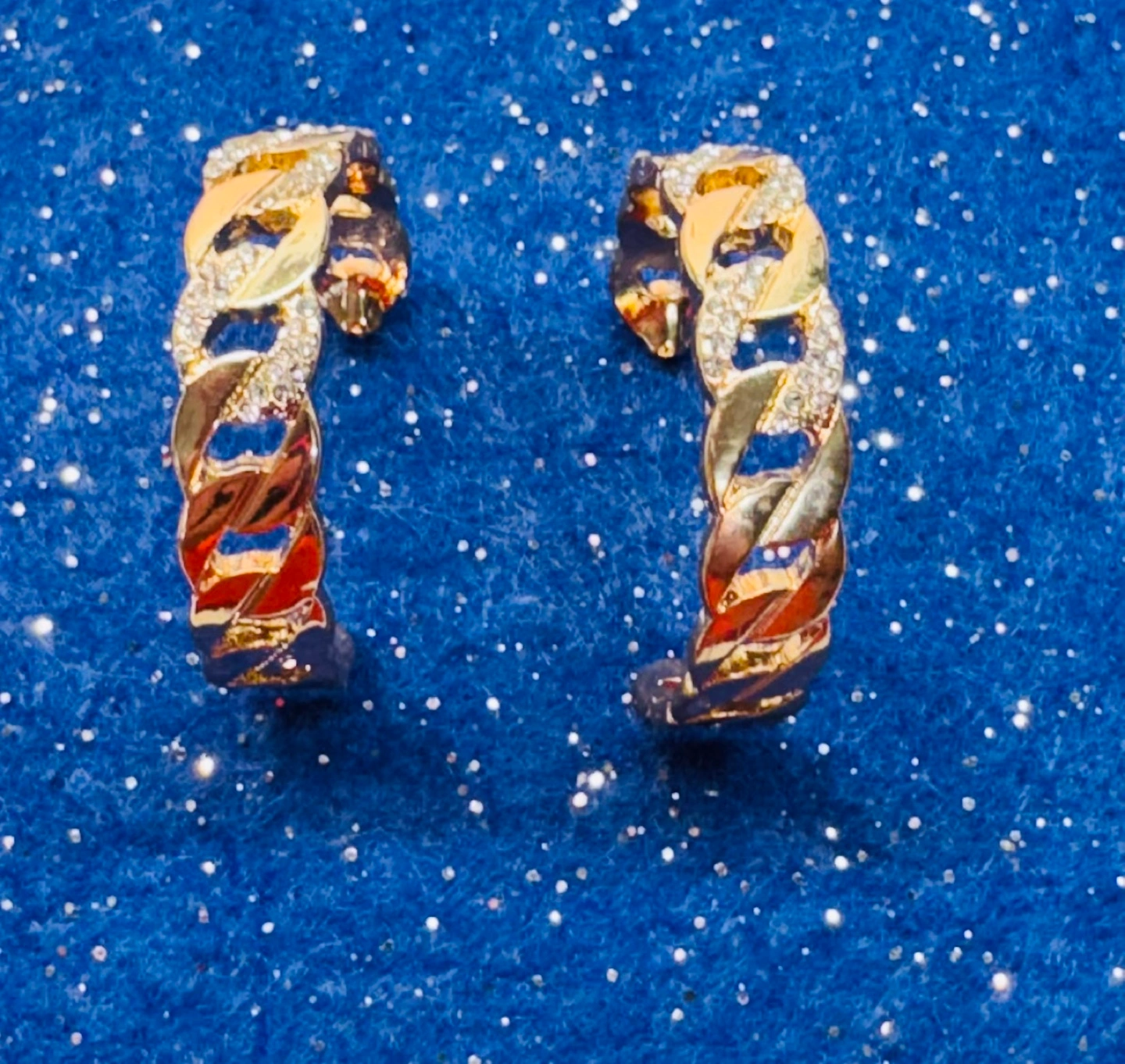 Stunning gold hoop earrings. Features a unique chain link design. Embellished with sparkling cubic zirconia stones. Perfect for adding a touch of elegance to any outfit.