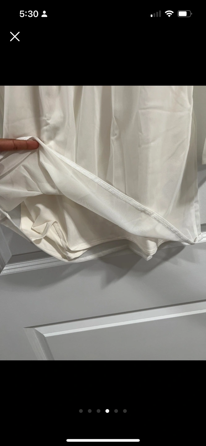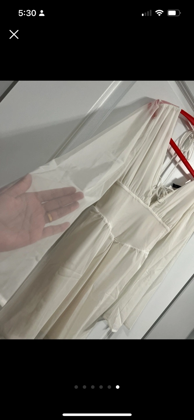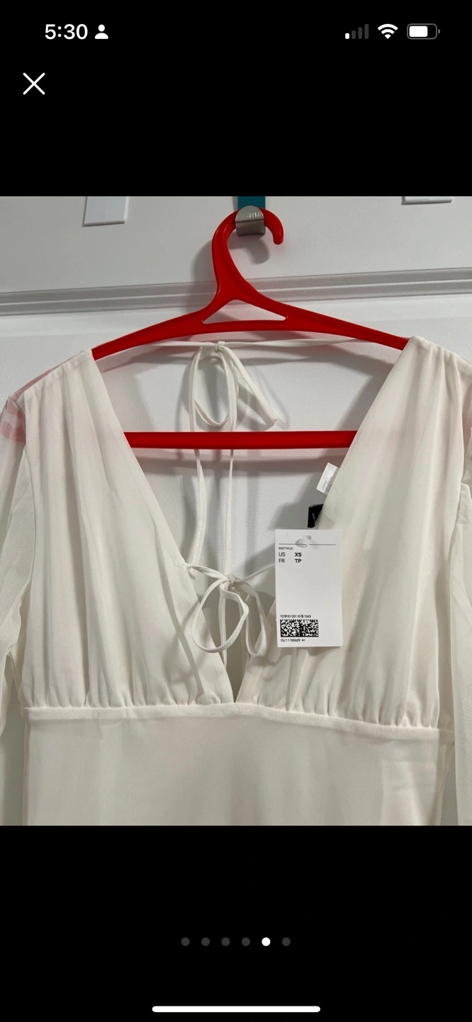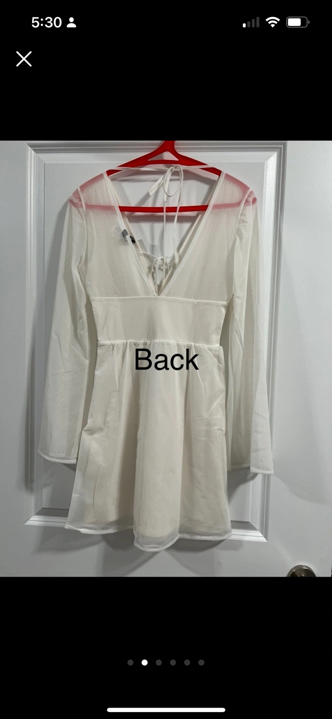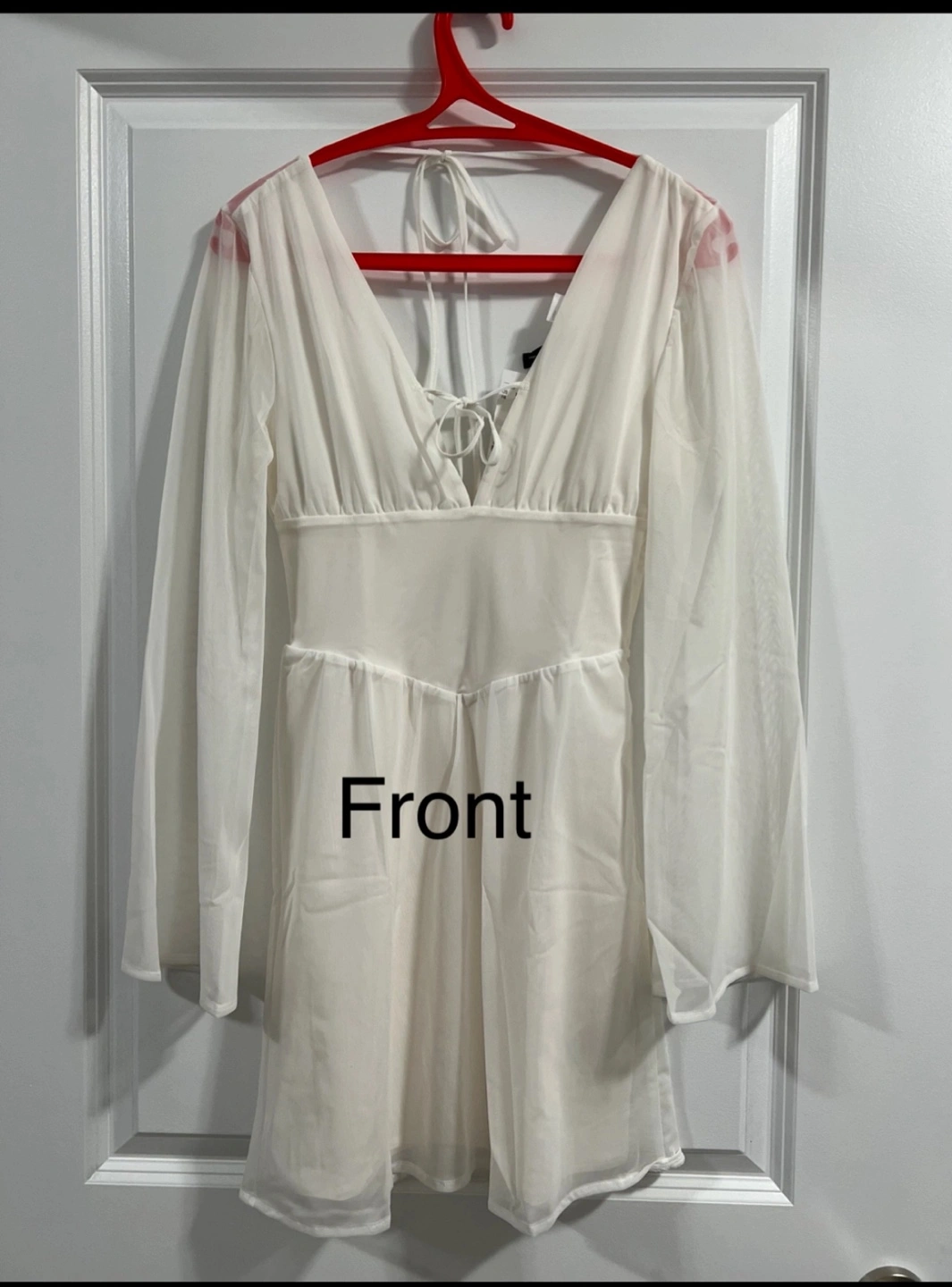Beautiful white mini dress. Features sheer long sleeves, a V-neckline, and a fitted bodice. Back tie detail. Lightweight and flowy fabric. Perfect for a summer or beach