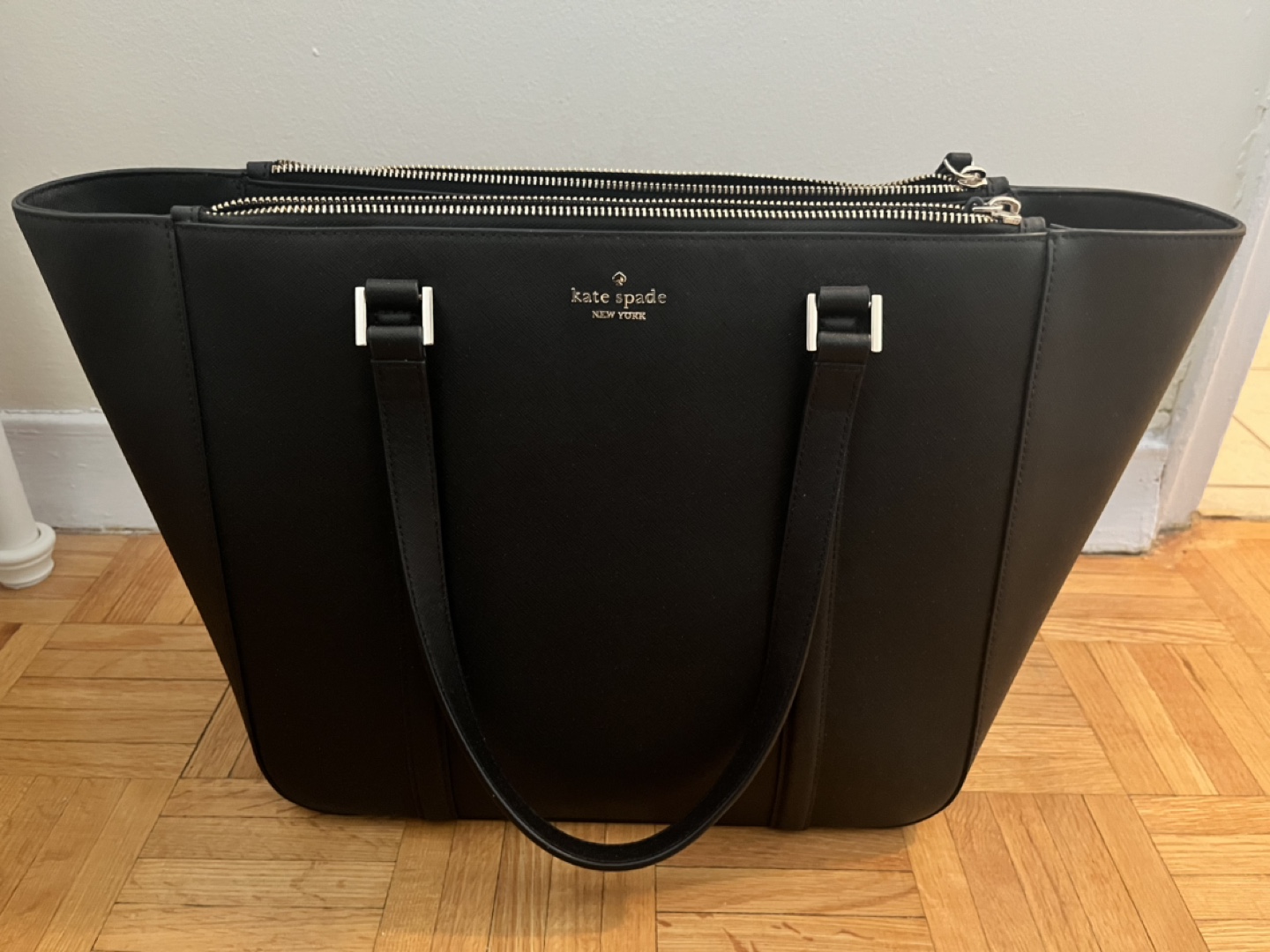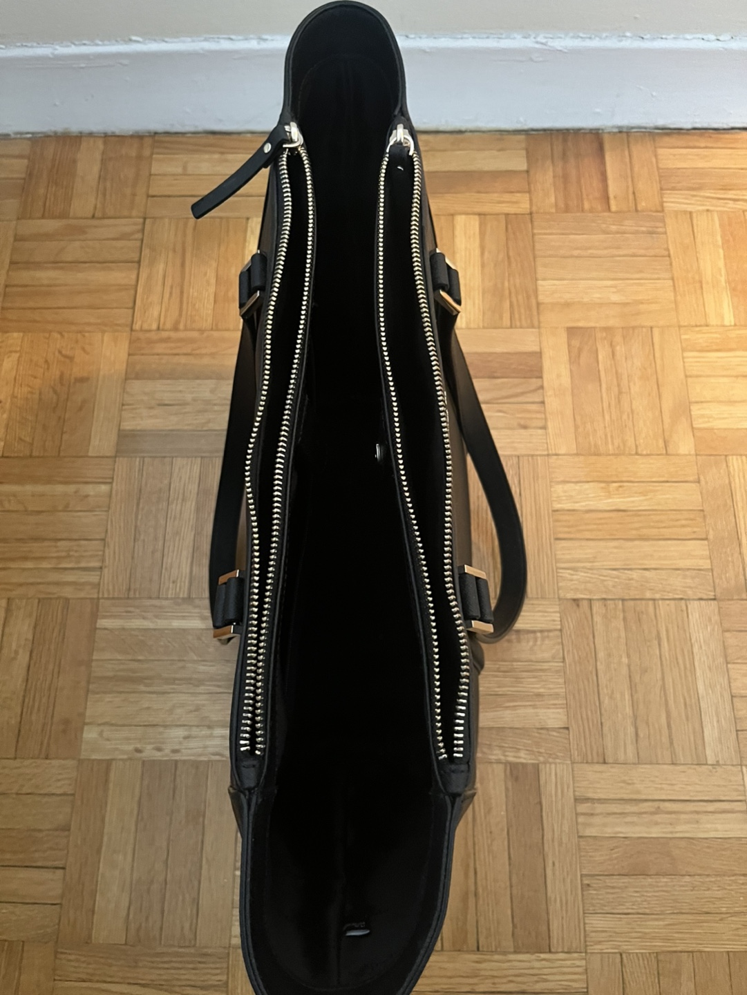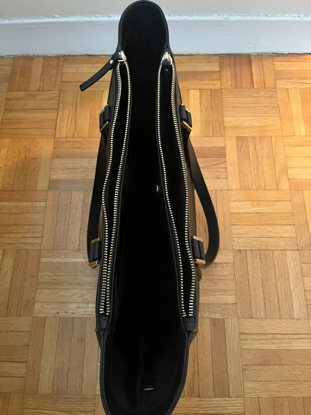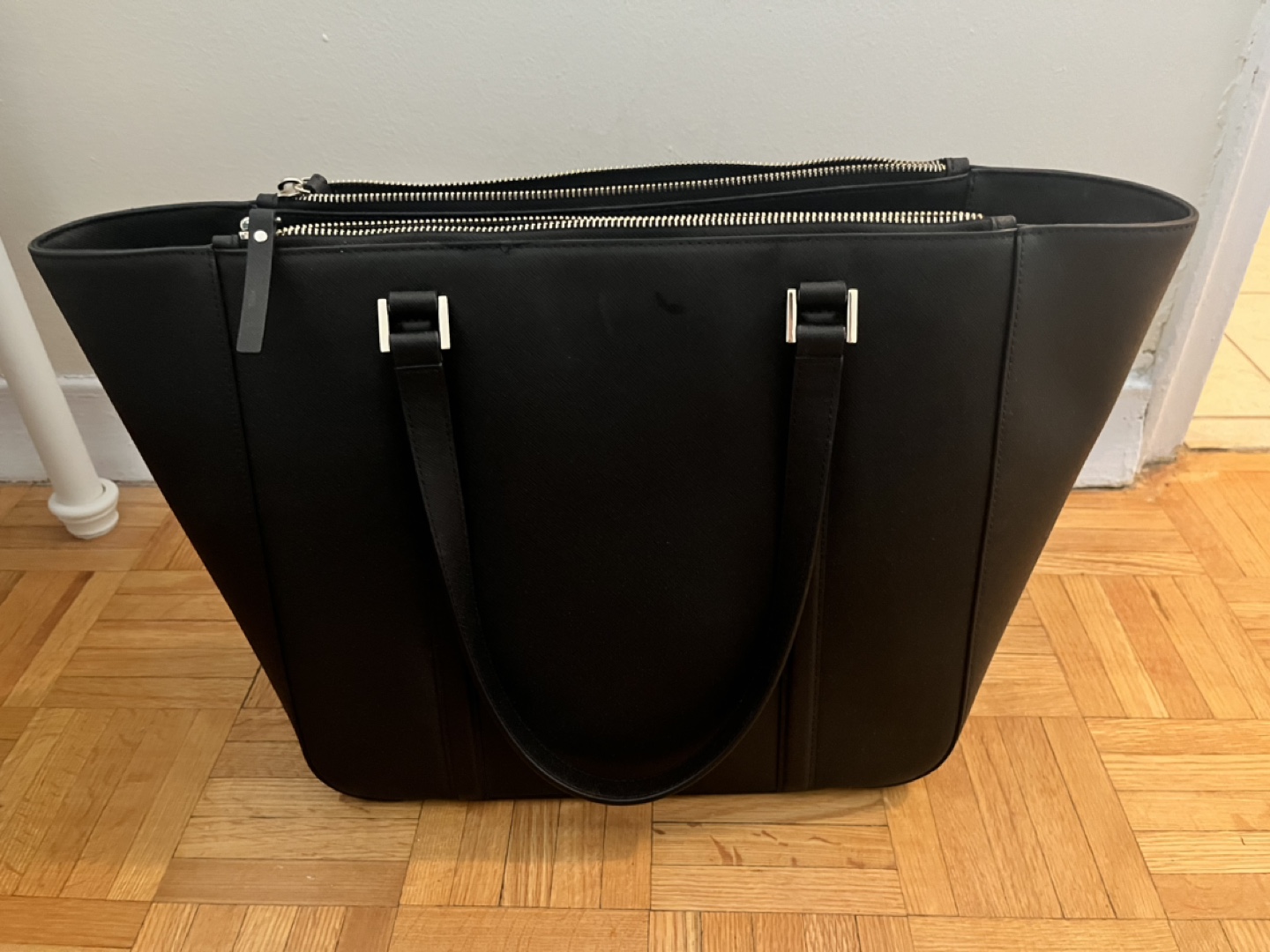 Large black tote bag. Double zippers. Two top handles. Great for work or everyday use. Used once only. Purchased for $150 on a deal.