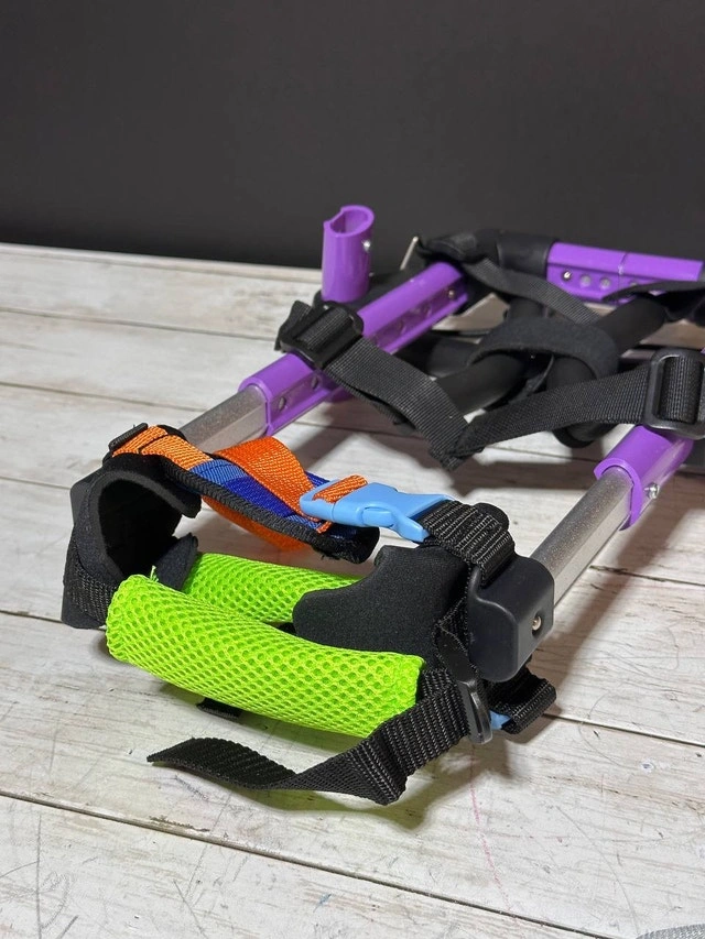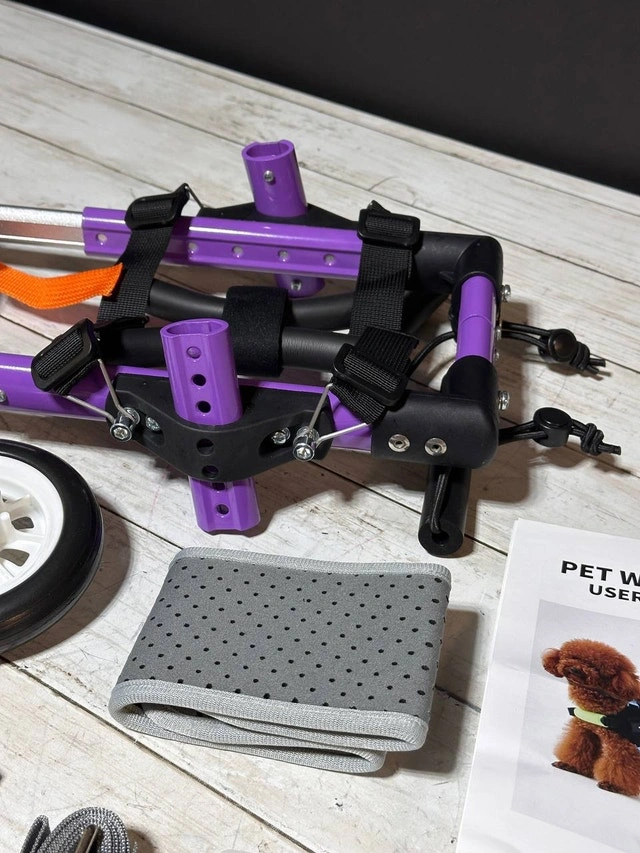 Designed for small disabled pets, this wheelchair provides hind leg support for injured or disabled pets, as well as cats and dogs with age-impaired mobility. With the help of wheelchairs, they can stay active and maintain a high-quality life. This wheelchair is made of lightweight aluminum alloy, which is resistant to wear, dirt, rust, durable and easy to carry. After wearing this wheelchair, pets can easily walk with it. The height, width and length of the pet wheelchair can be adjusted according to the pet's body without disassembly. This wheelchair adopts a buckle design, and the traction rope can be hung on the buckle to avoid losing the pet, which is very convenient.