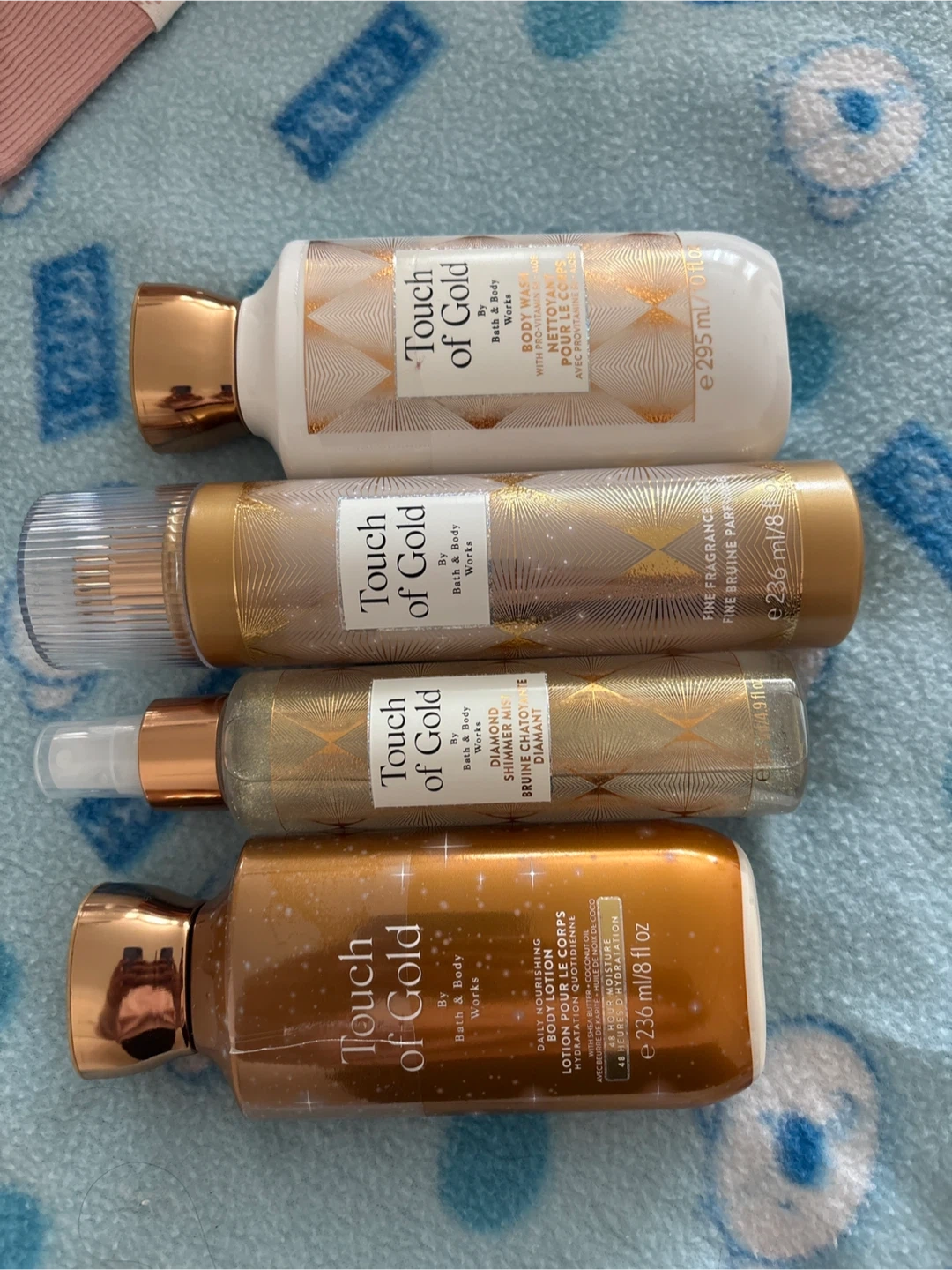 This set includes a Bath & Body Works Touch of Gold Daily Nourishing Body Lotion (236ml), Diamond Shimmer Mist (236ml), and Body Wash (295ml). The lotion provides 48-hour moisture with shea butter and coconut oil.
