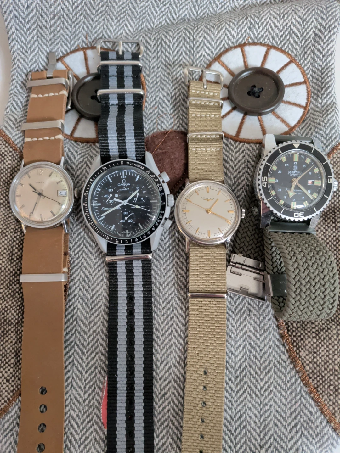 Four distinct watches for collectors. Includes an Omega Speedmaster, a Timex 1960's, a classic 1960's Longines timepiece(not original crystal face), and a vintage Mortima diver watch. This assortment offers a variety of styles and brands for watch enthusiasts. All watches in great shape, bands are brand new.... Not a watch expert, so that's it.