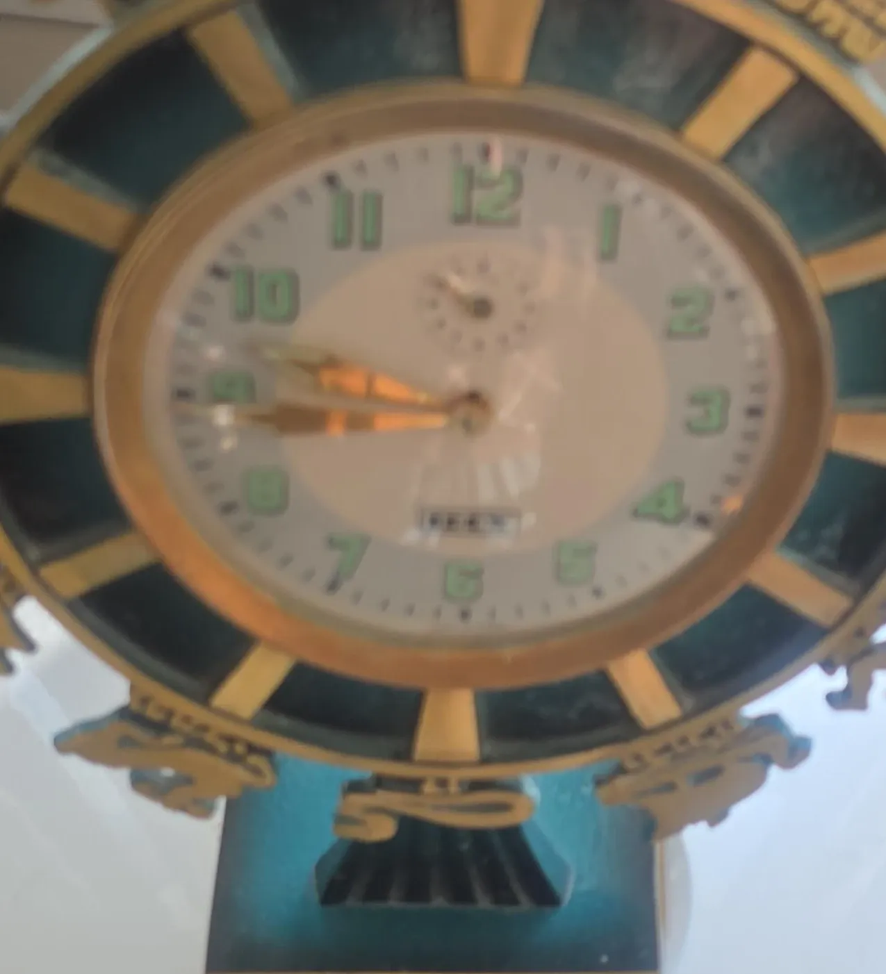 This is a vintage FEEX alarm clock. It has a classic design with a teal and gold-toned frame. The clock face features easy-to-read green numbers and gold hands. A great accent piece for any room! 1963.