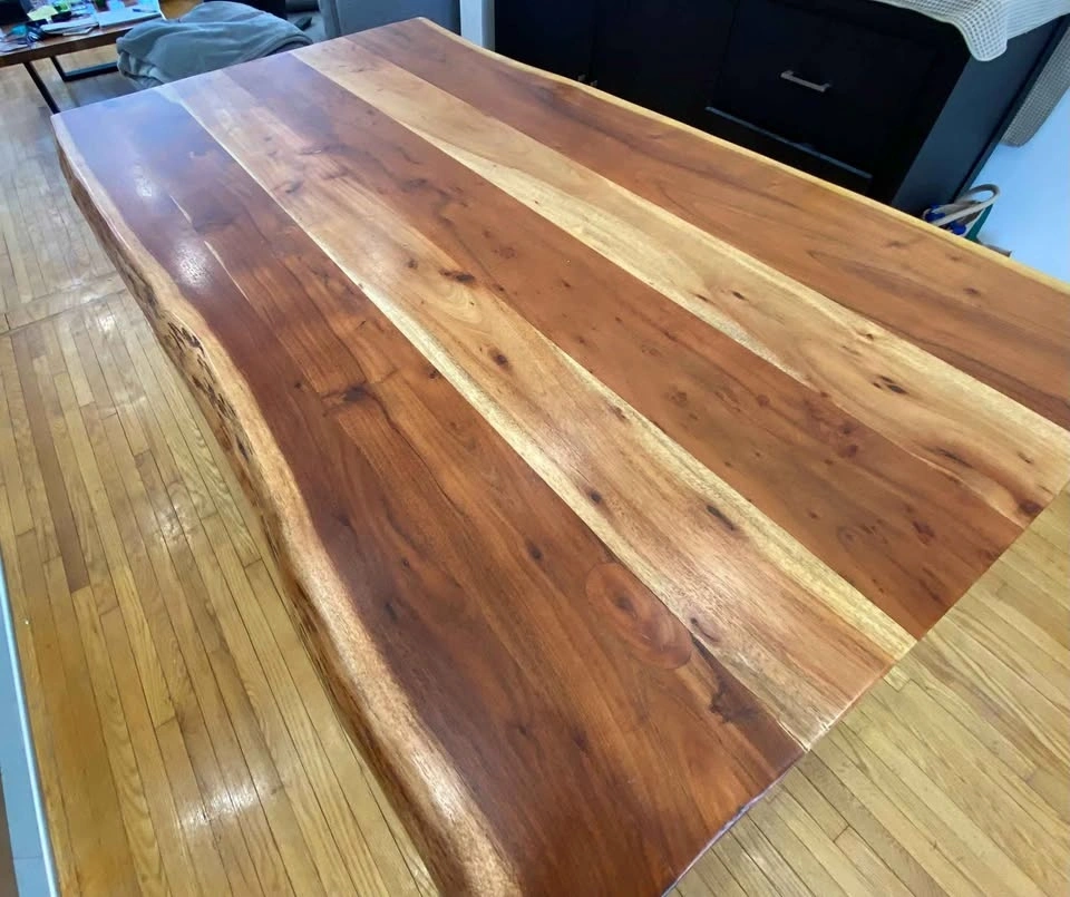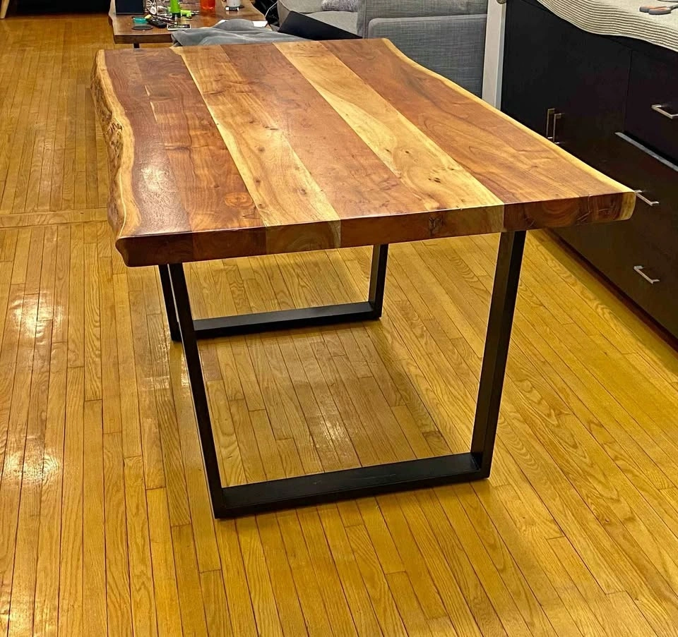 Wazo live edge dining table featuring solid, thick Acacia wood slab with natural, irregular edges and, black metal U-Shaped legs for a natural yet modern, industrial look. Dimensions: 59 Inches long by 35 inches (varies | live edge) wide by 30 inches high. Slab is 2 inches thick. 2 Bench: Wazo live edge dining table Bench featuring solid, thick Acacia wood slab with natural, irregular edges and, black metal U-Shaped legs. 57 Inches long by 15 inches (varies | live edge) wide by 18 inches high. Slab is 2.5 inches thick. Table $1000. Benches $350 each. Or everything (table and 2 benches) for $1350.