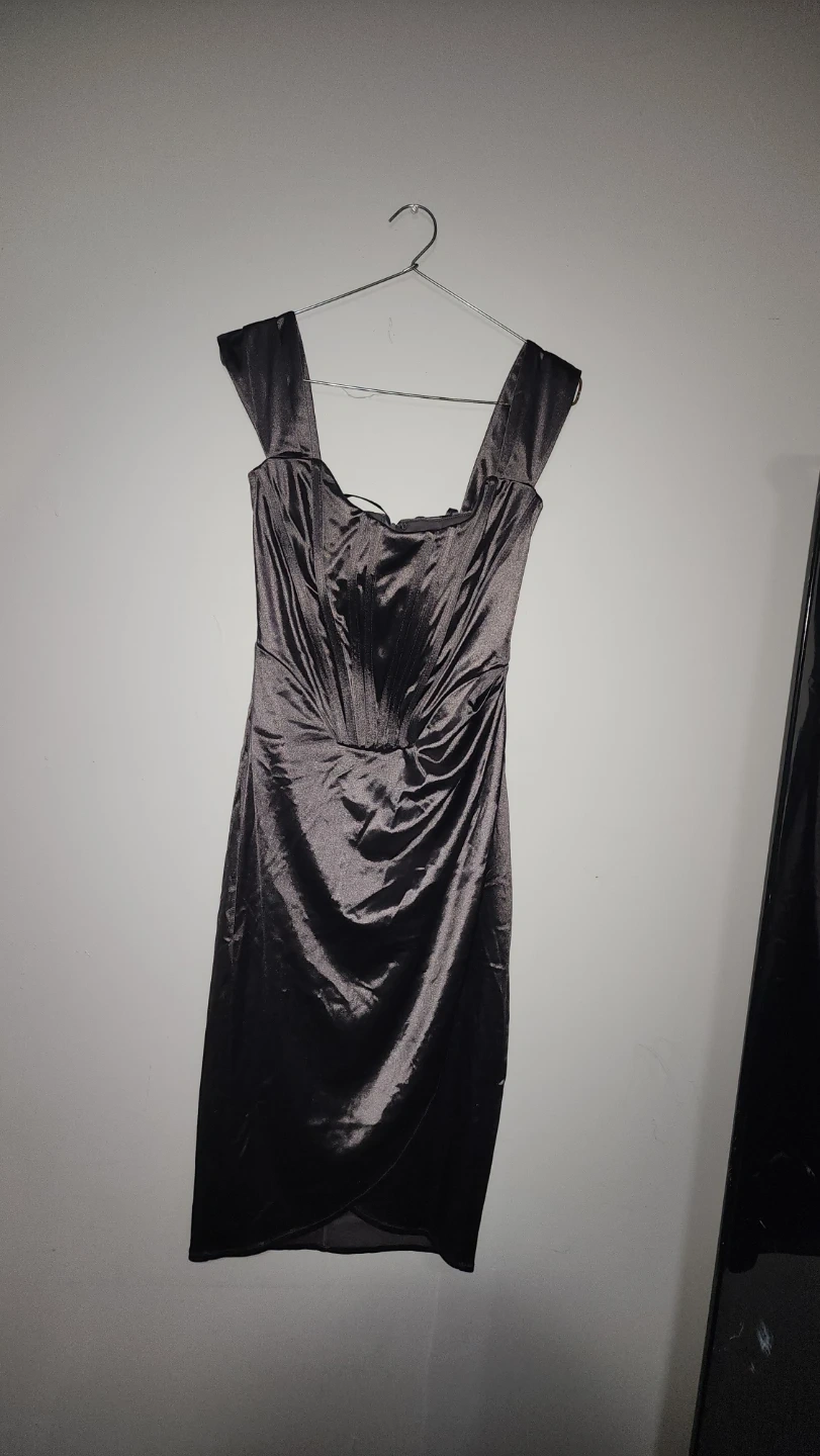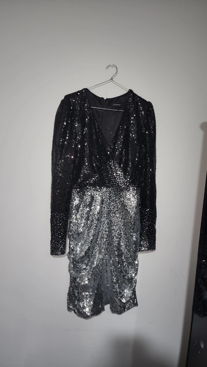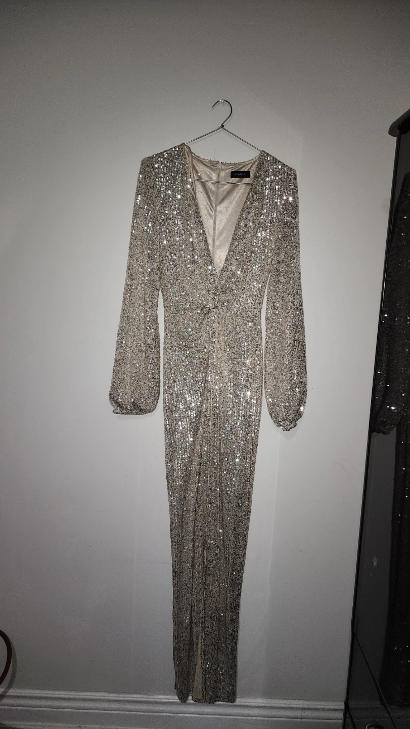 Various women's dresses are available. Styles include sequined maxi dresses, satin cocktail dresses, and a long-sleeved black dress with mesh details. Materials and sizes vary by dress.
