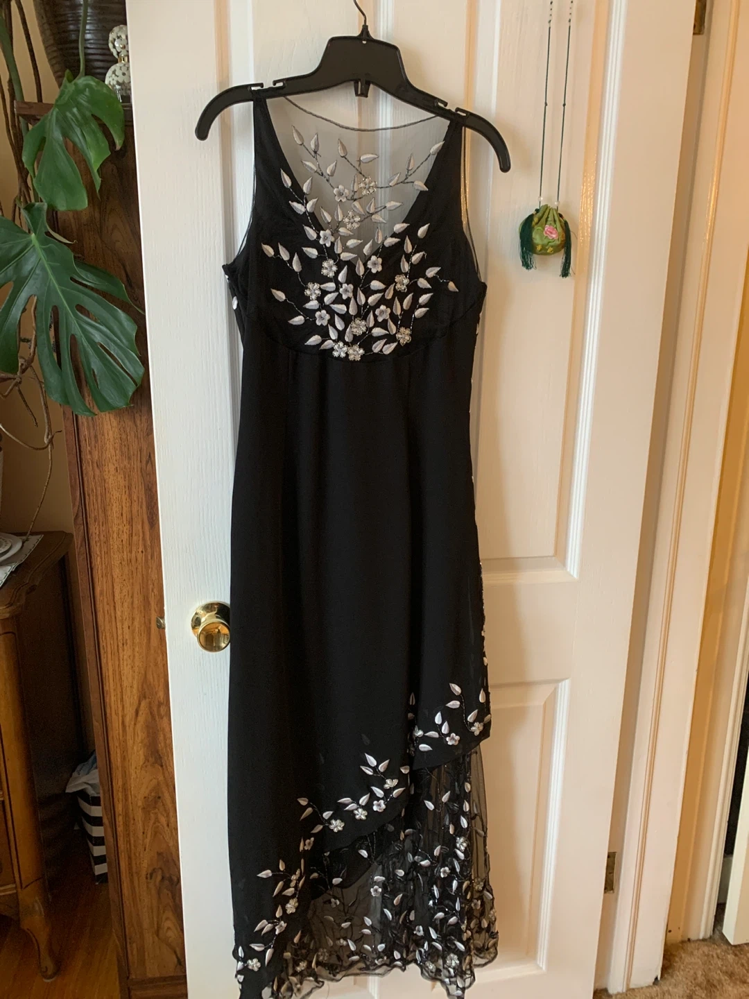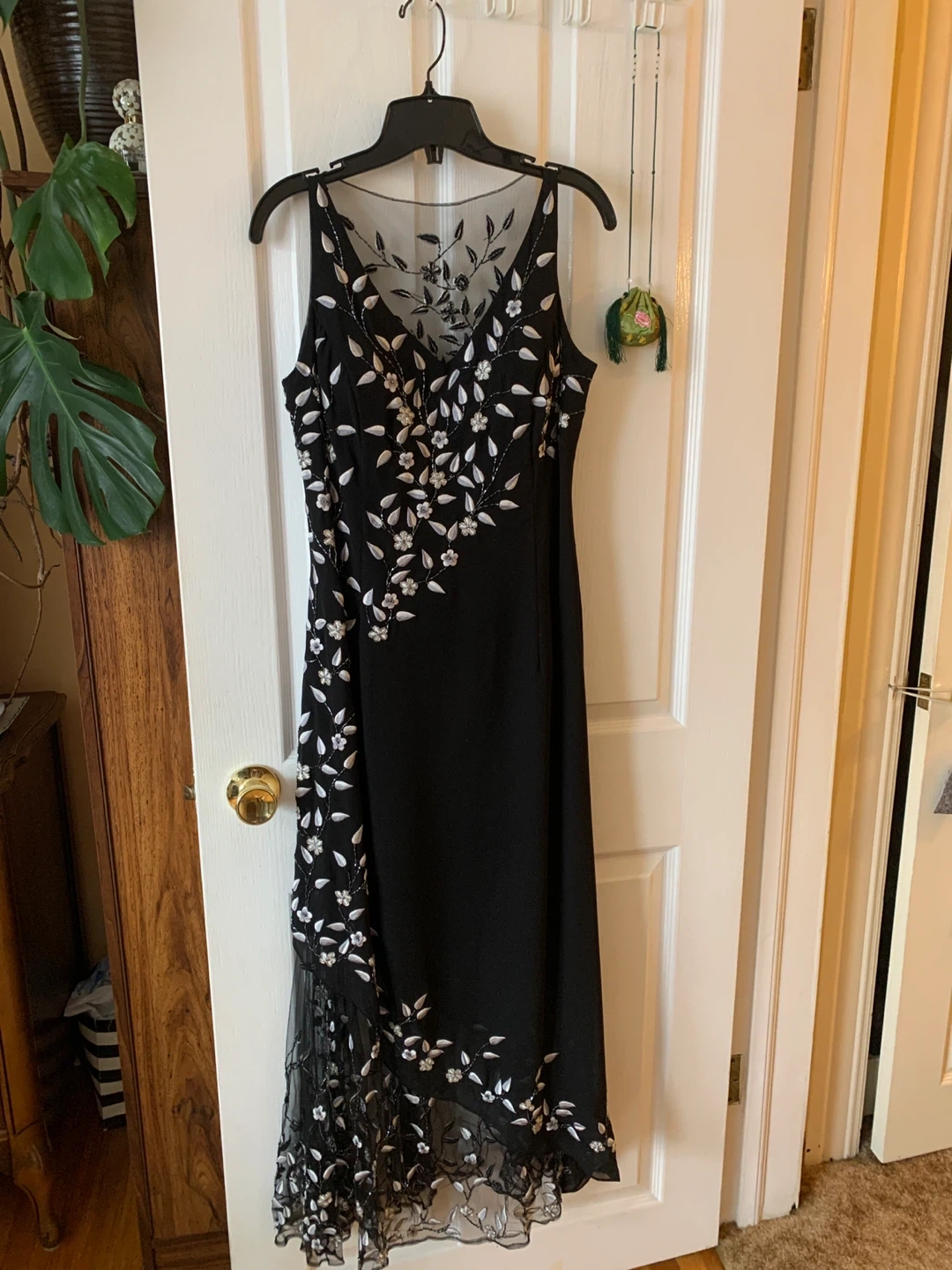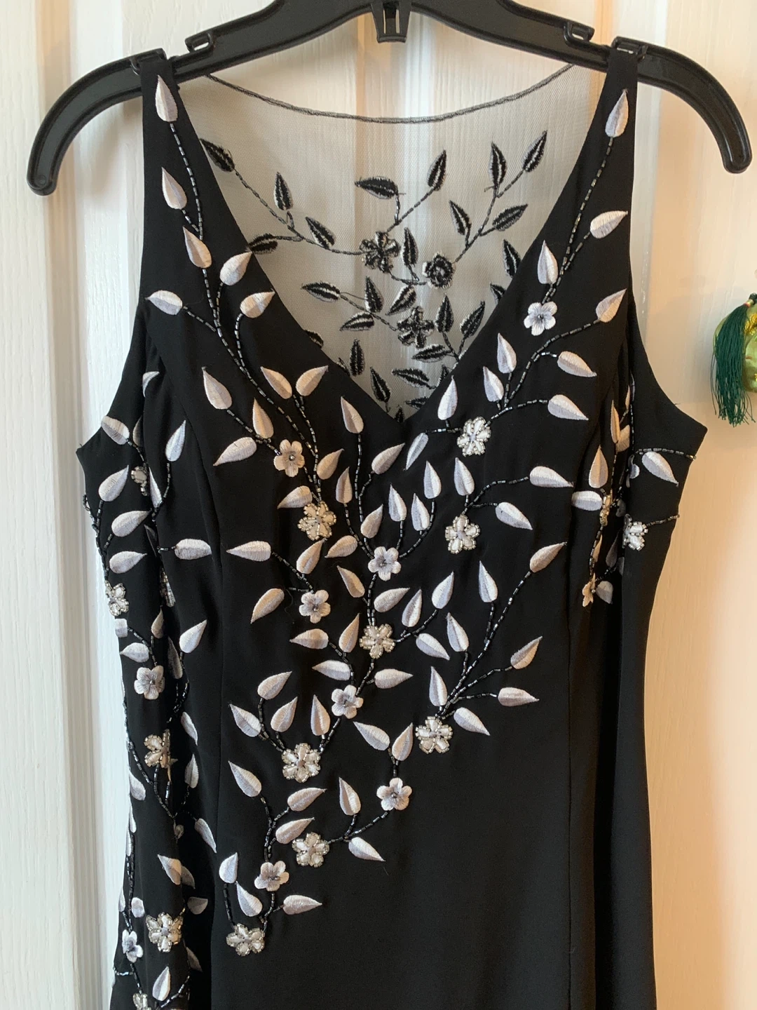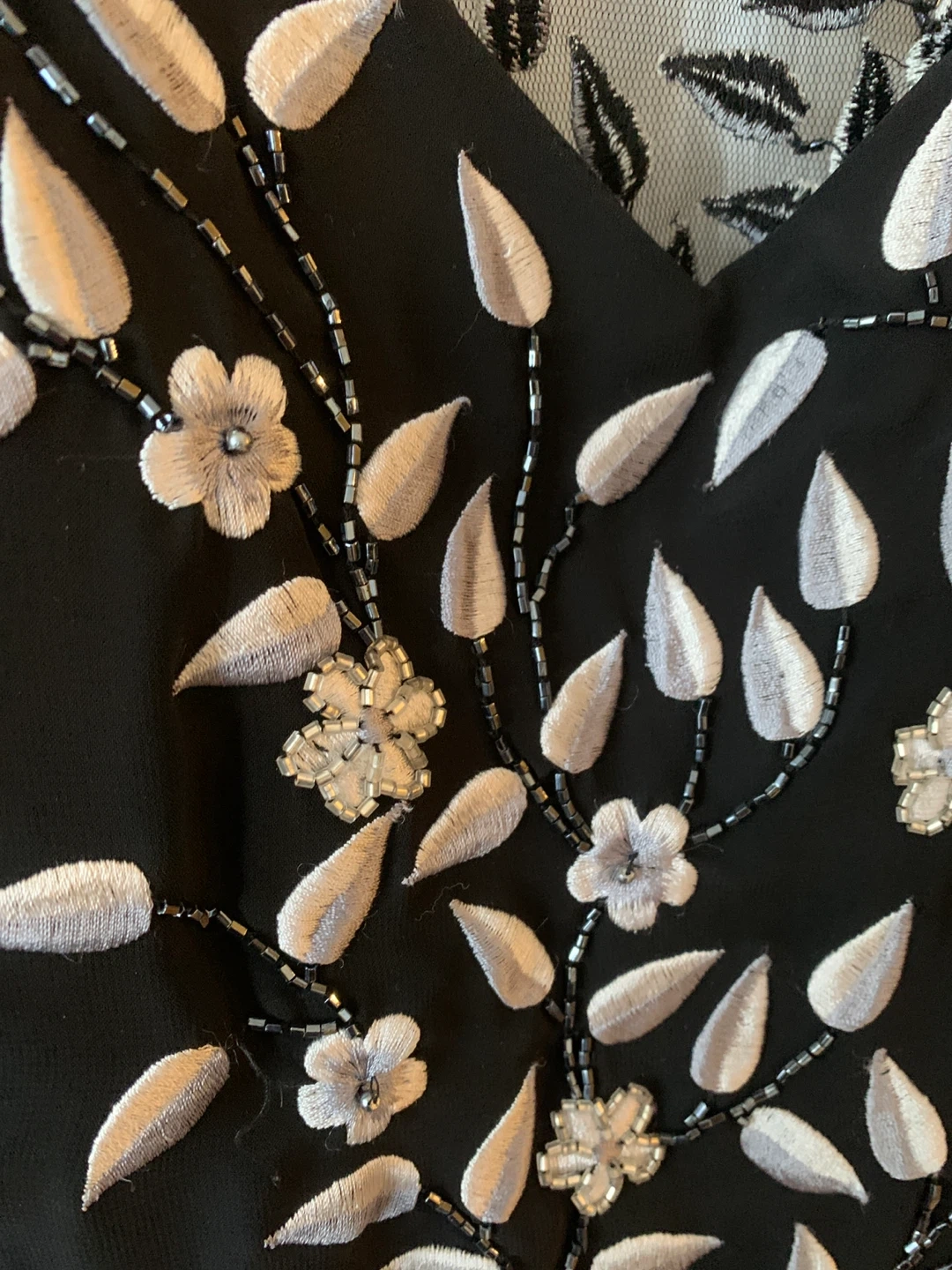 This elegant black maxi dress features intricate white floral embroidery and beadwork. It has a sheer neckline with delicate leaf and flower embellishments. The sheer hem adds a touch of sophistication. medium-sized.