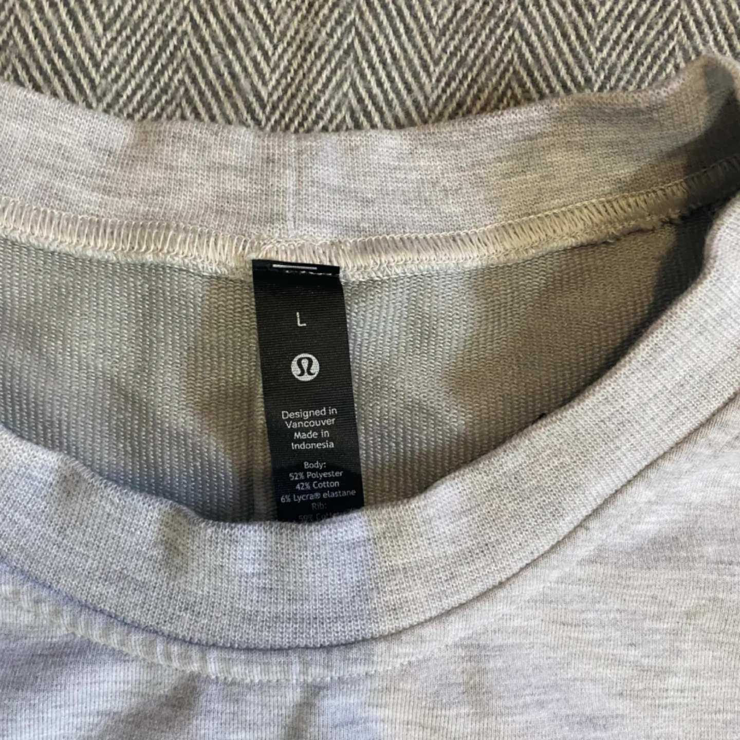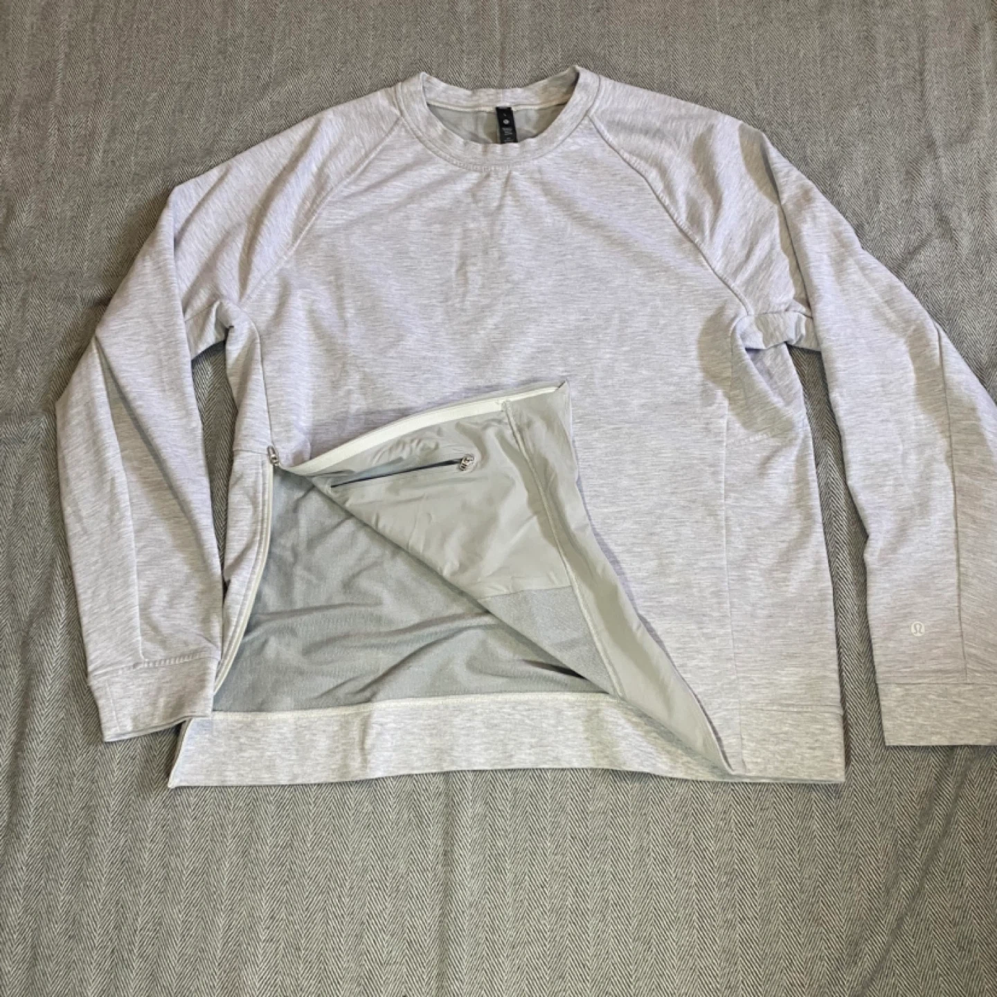 This Lululemon “City Sweat” crewneck sweatshirt is a size Large. It's made with a blend of 57% polyester, 42% cotton, and 6% Lycra elastane. Features a zippered side pocket.