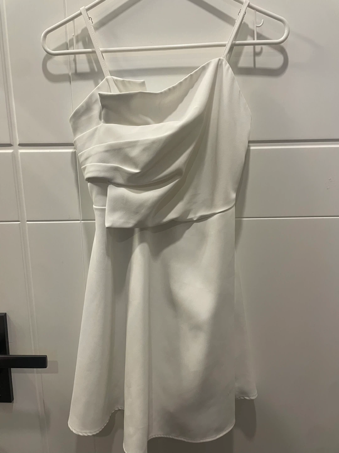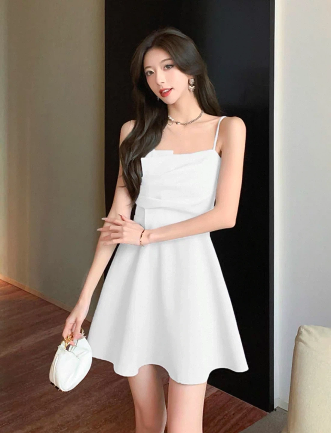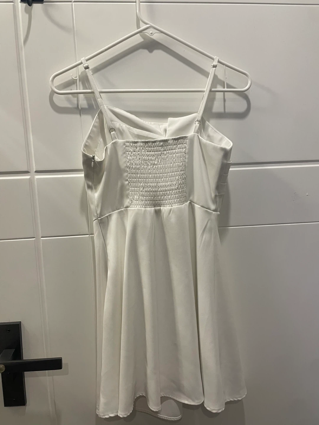 A cute white mini dress with a square neckline and ruched detailing. It features adjustable spaghetti straps and a smocked back for a comfortable fit. Perfect for summer outings or parties!