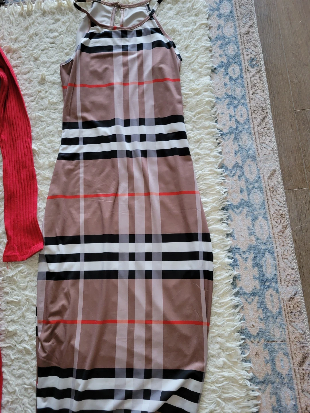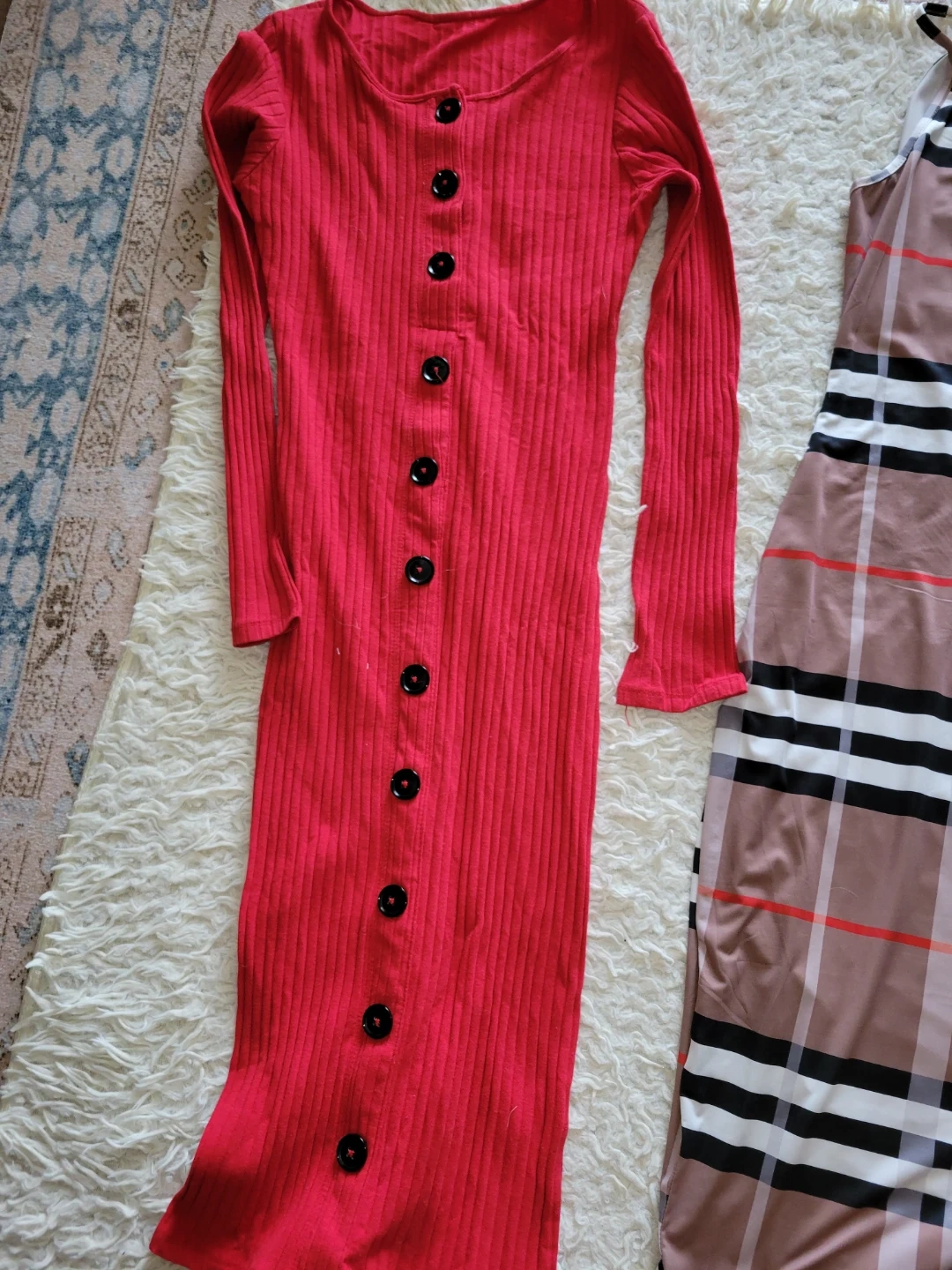 Ribbed red button-front maxi dress with long sleeves. Sleeveless plaid print halter neck maxi dress. Both dresses are size small and made of stretchy fabric. These stylish dresses are perfect for a casual outing or a night out!