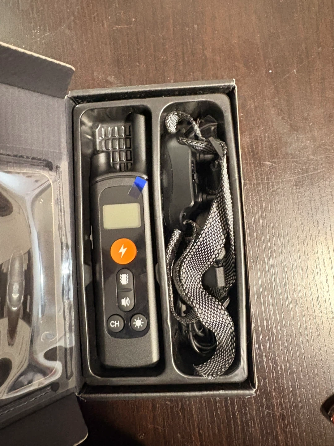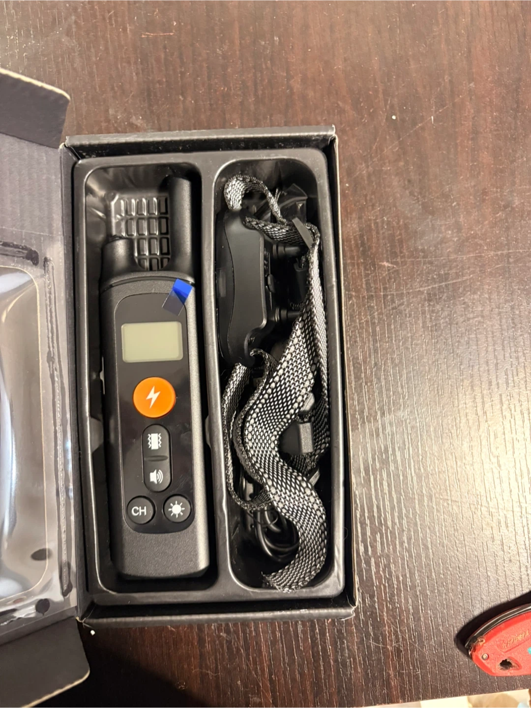 This dog training collar features a backlit LCD display and 3 training modes: vibration, tone, and shock. It's IP67 waterproof. Included is the collar, remote, and USB charging cable.