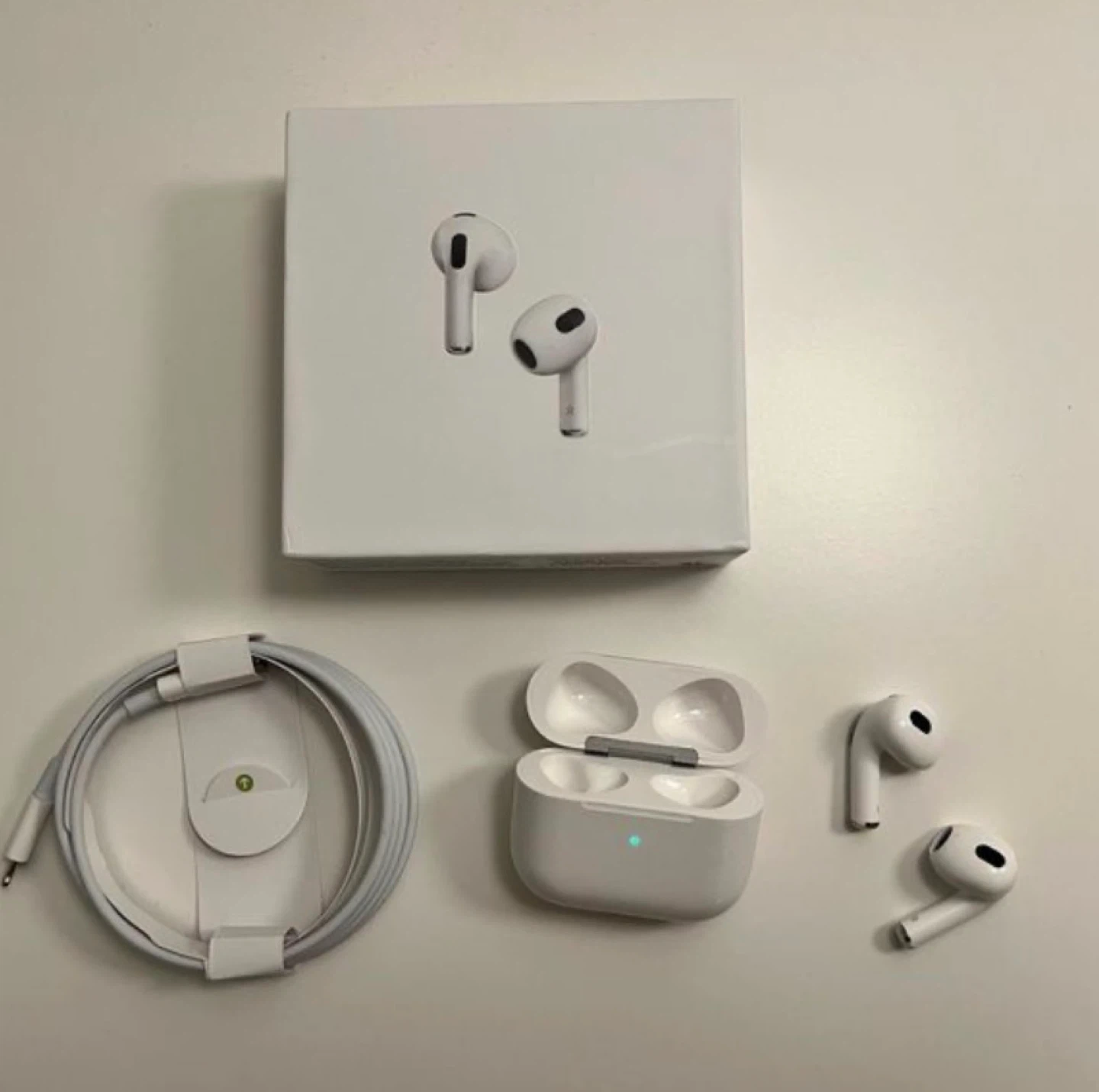 These are Apple AirPods (3rd generation). They come with a charging case and a USB-C to Lightning cable. Includes original box.